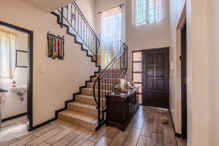 The open plan kitchen is both functional and stylish, featuring granite countertops, a breakfast nook, plumbing for a dishwasher, and an electric stove and oven. A separate back door leads to the washline area, keeping everyday chores organized and unobtrusive. A guest toilet is thoughtfully tucked away at the base of the stairs for convenience.