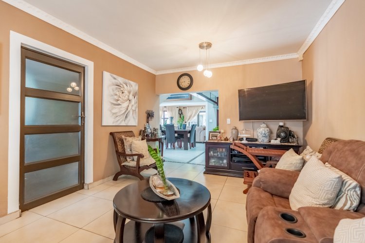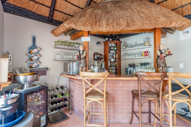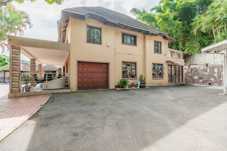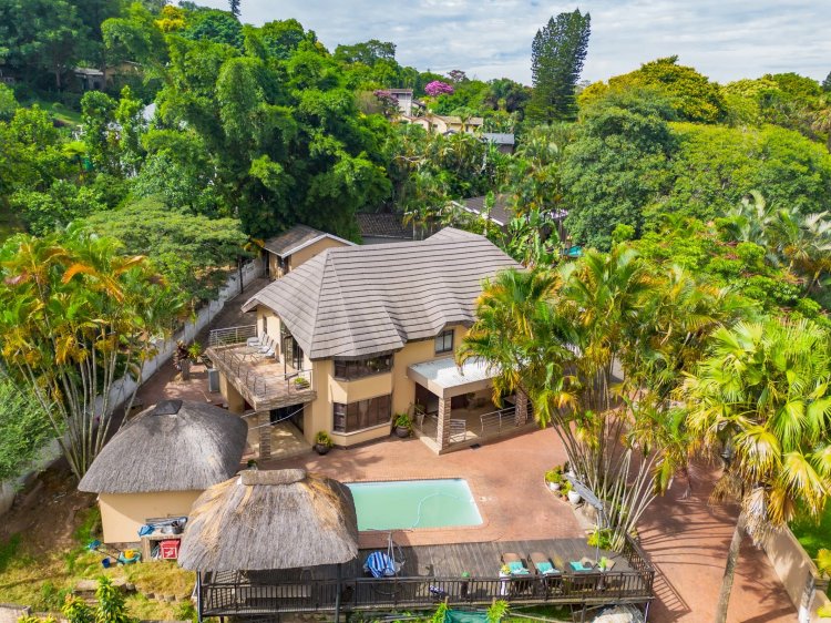 The main house blends warm beige tones with a distinctive thatched roof accent that adds authentic KZN charm and character. Large wooden doors and windows open seamlessly from the interior to the pool deck, blurring the line between indoors and out living and entertaining.