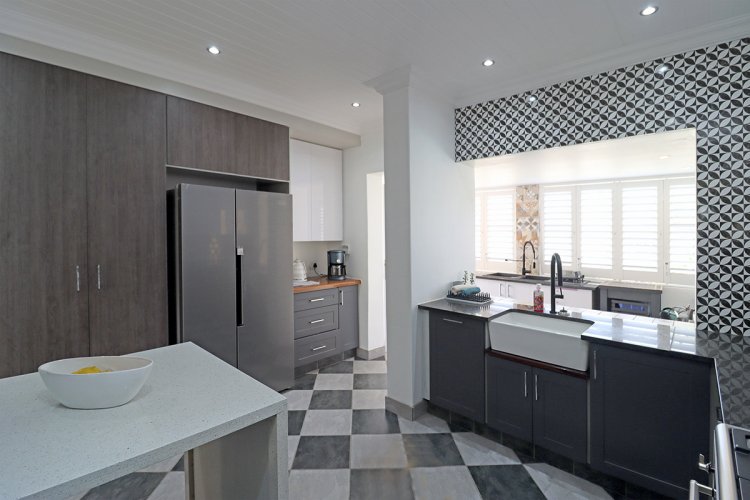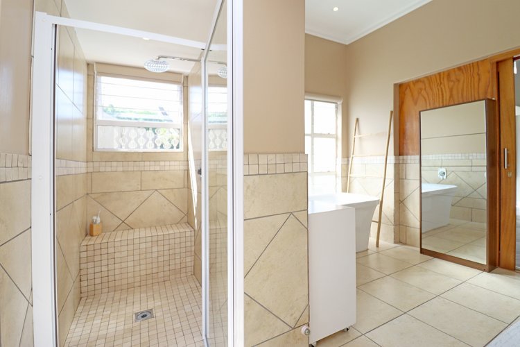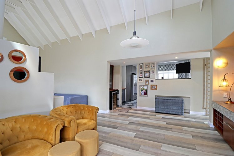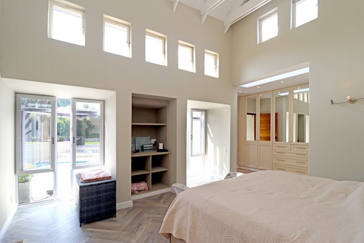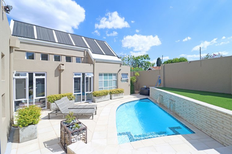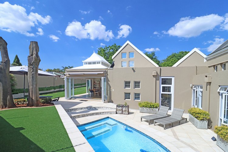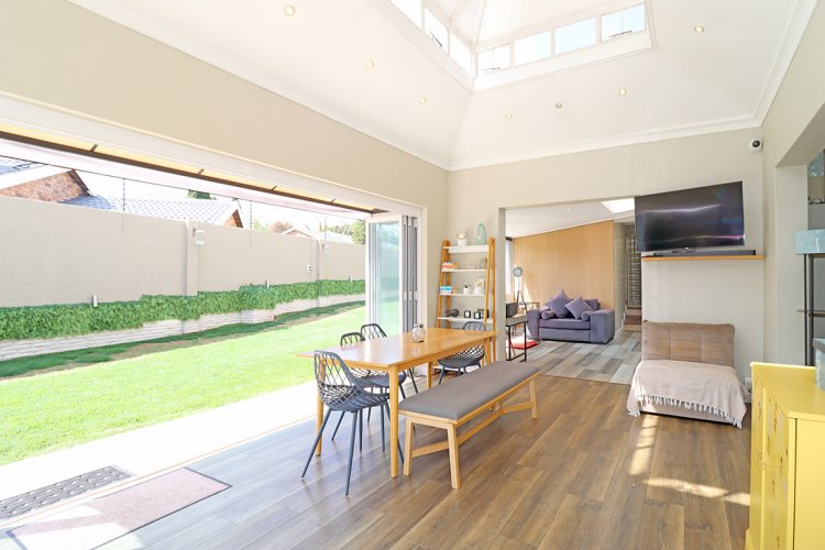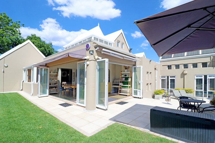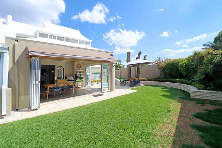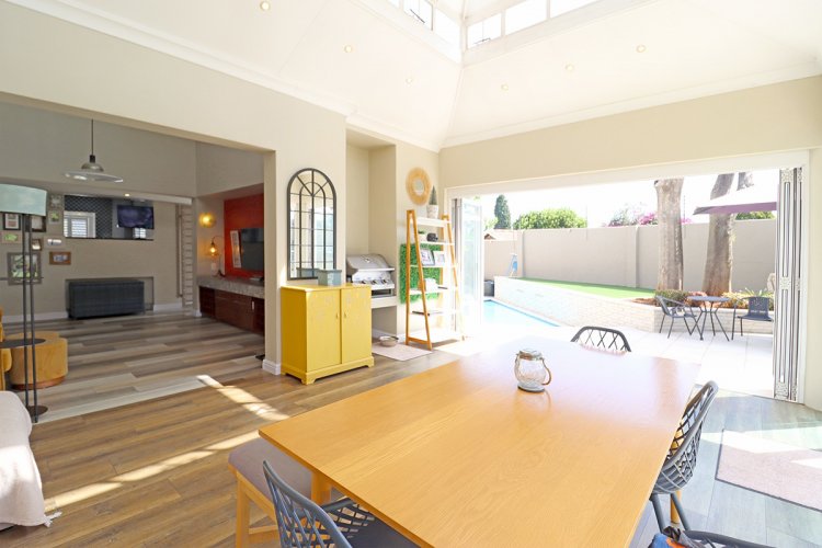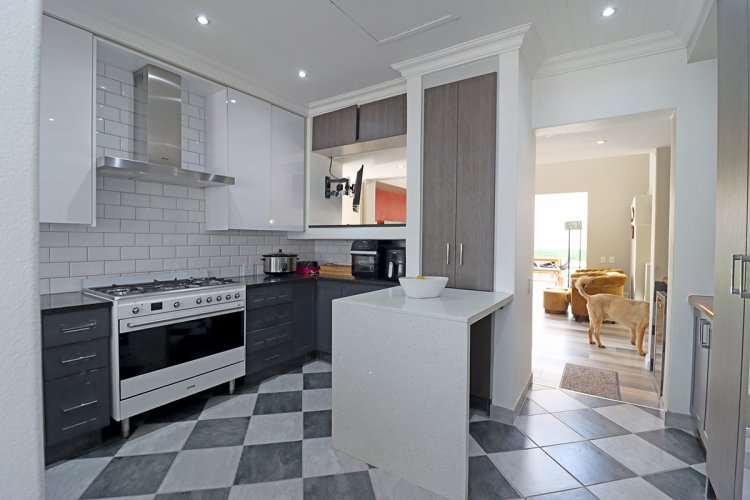 A huge enclosed patio with a built in wood burning braai and a gas braai. Stacker doors open out onto the stunning swimming pool and garden. A thoroughly modern kitchen offers you a state of the art gas stove, hi gloss white cabinets, and a scullery / laundry. Enclosed courtyard.