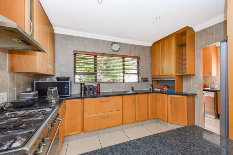 Open plan gourmet granite kitchen with a breakfast bar, gas hob, under counter oven, prep bowl, space for a double door fridge and a separate scullery with space for 3 appliances.