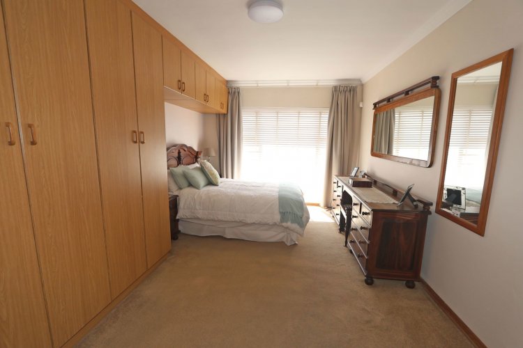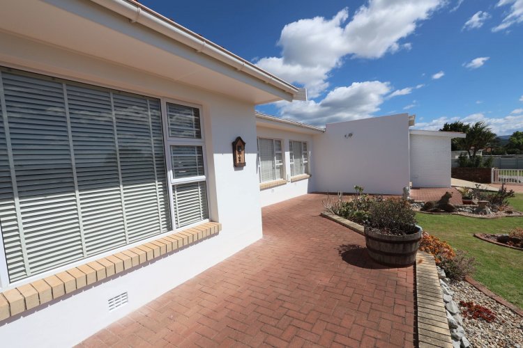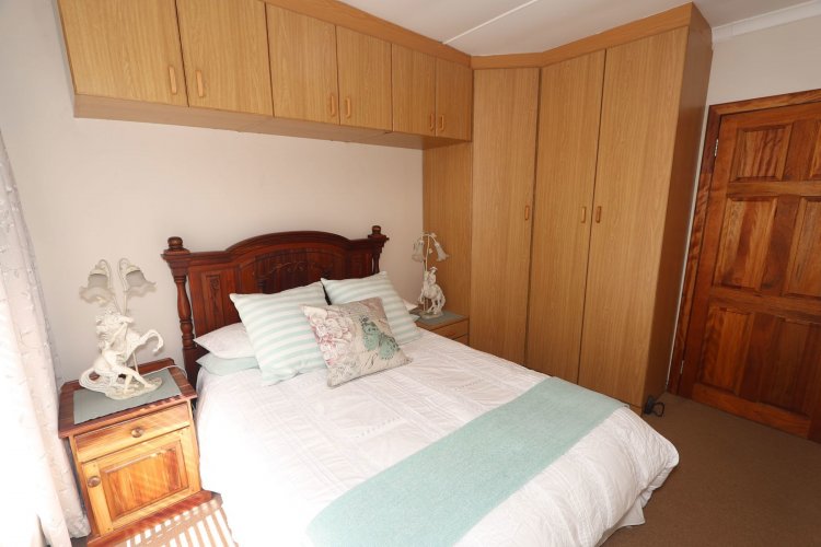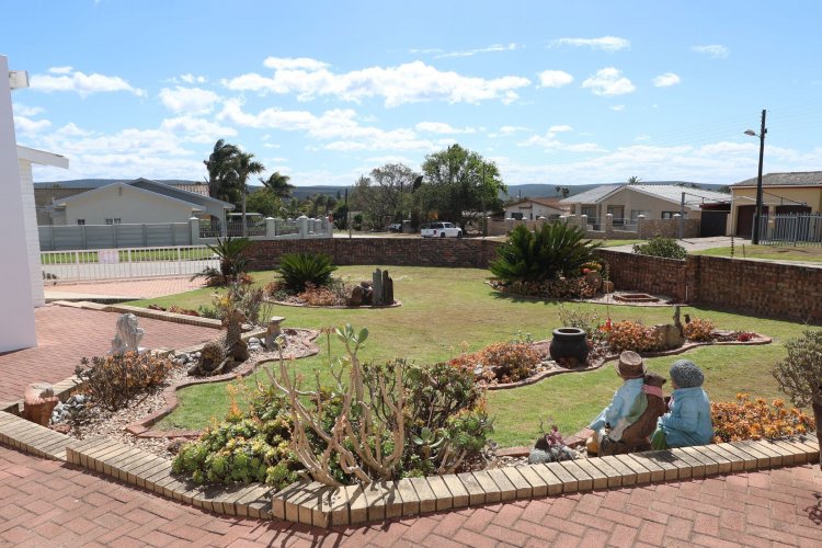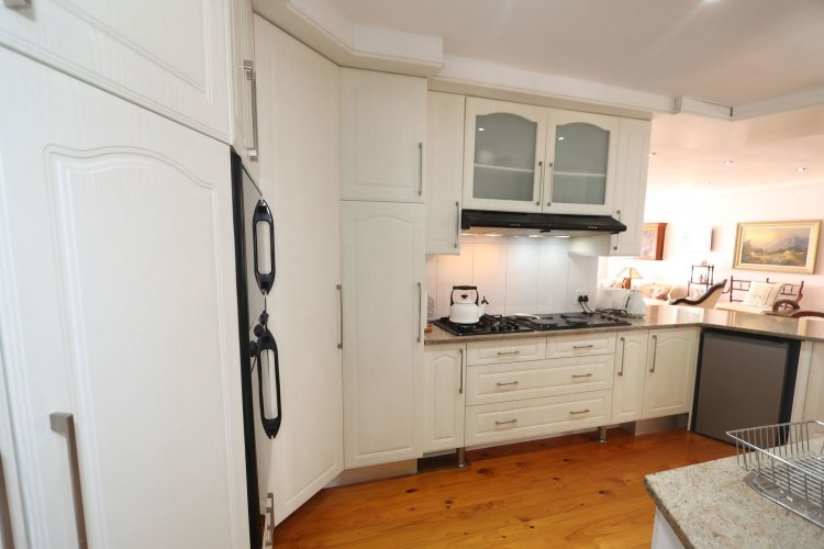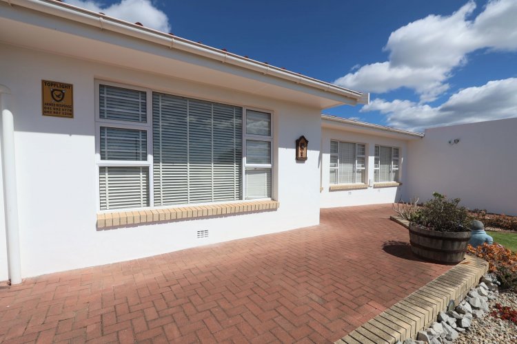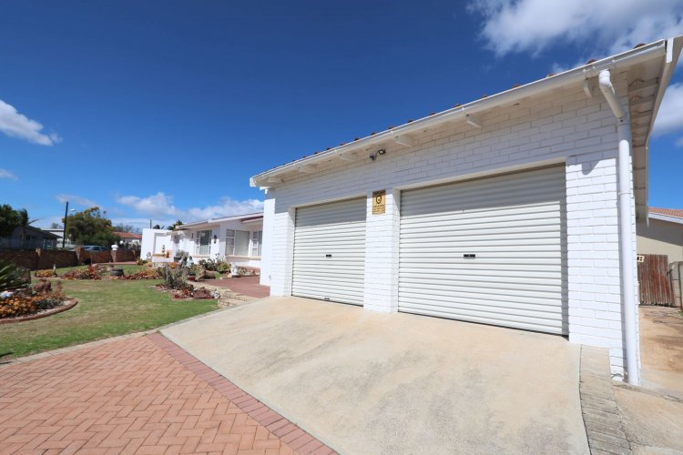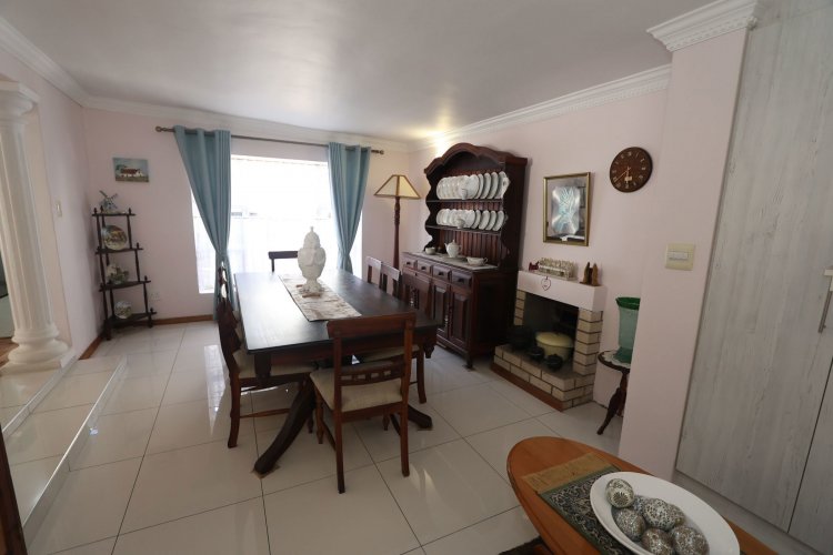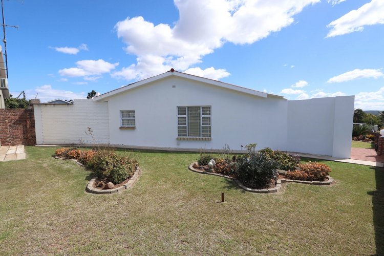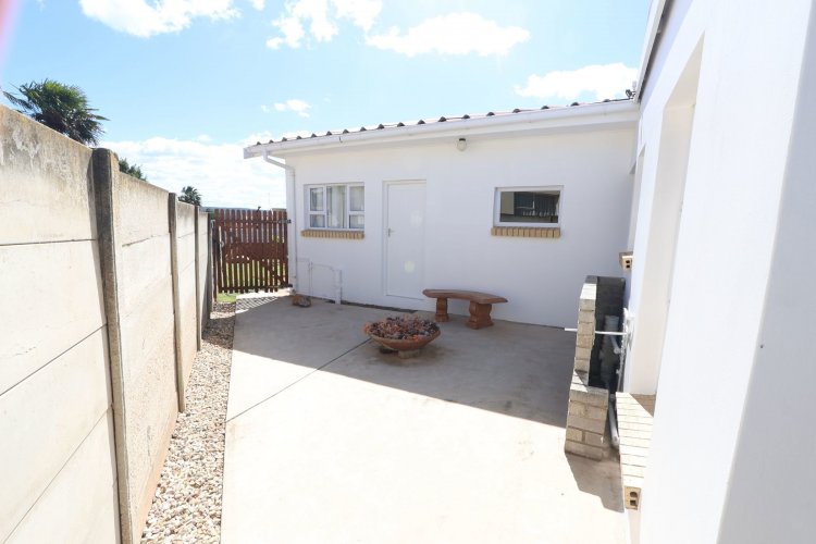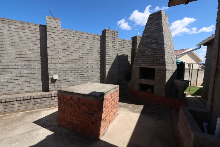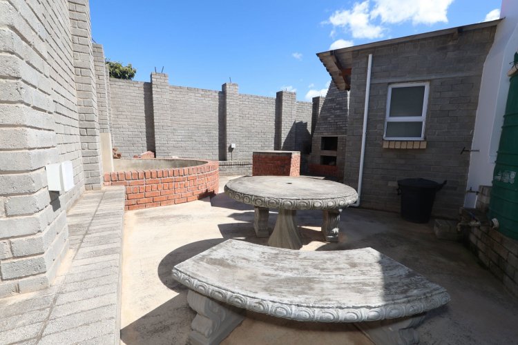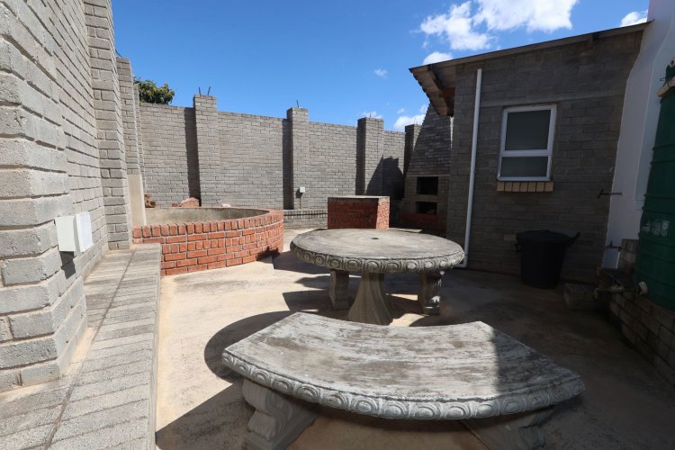 The double garage at the front accommodates up to four vehicles and includes a convenient toilet and basin. Beyond, the fully walled garden is enhanced by an alarm system and dotted with decorative touches that will remain with the property. Perfect for gatherings, the outdoor braai area offers built-in seating and a central table.