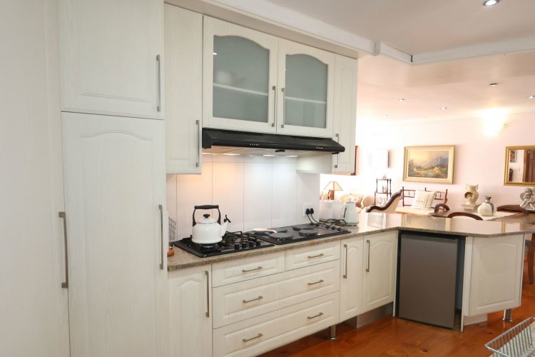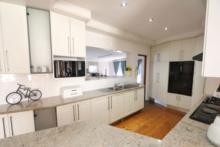 Step through the welcoming entrance hall into an expansive open-plan layout where generous sized lounge and warm wooden floors create a sense of space and character. The sleek, contemporary kitchen comes equipped with a gas and electric hob, high-level oven and plentiful built-in cupboards. A versatile room next to the kitchen, complete with additional cabinetry, easily serves as a pantry, linen room or utility space for larger appliances.