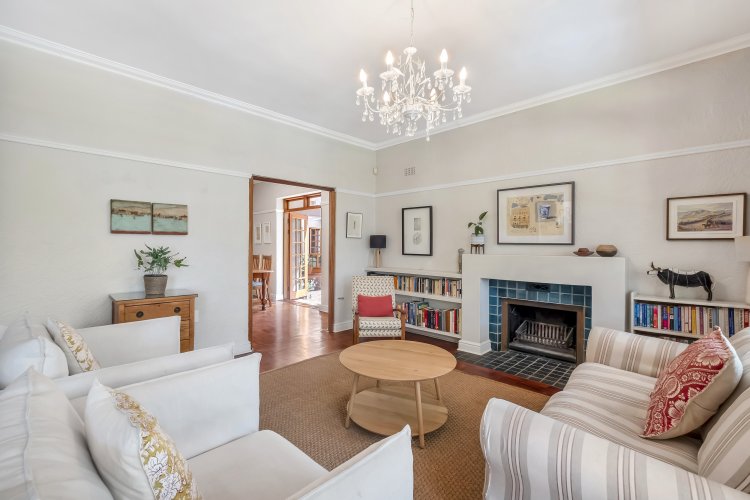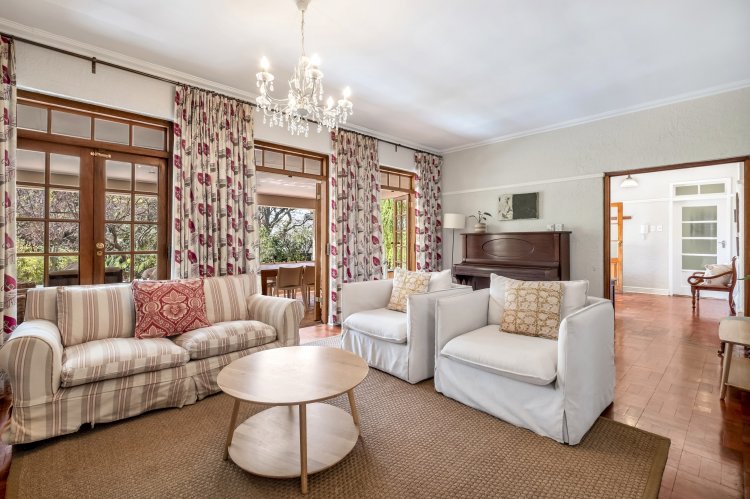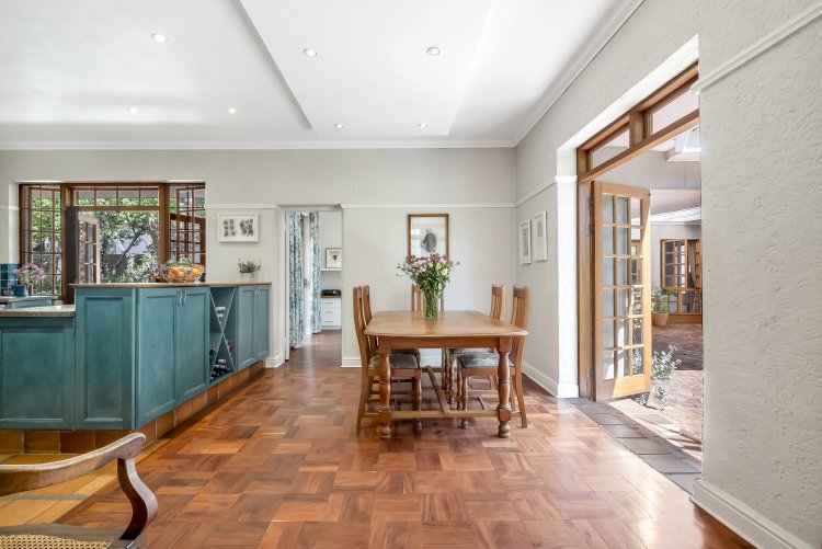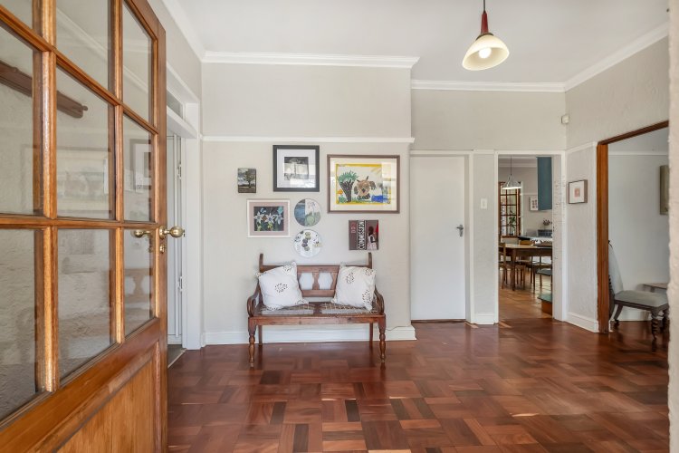 The journey continues past the sparkling pool and along a charming, paved path, up the stairs and onto a covered patio that sets the tone for what lies within. Step inside, and the entrance hall with its rich parquet floors immediately makes a statement. The clever layout separates the home into two wings: bedrooms on the left, living spaces on the right.