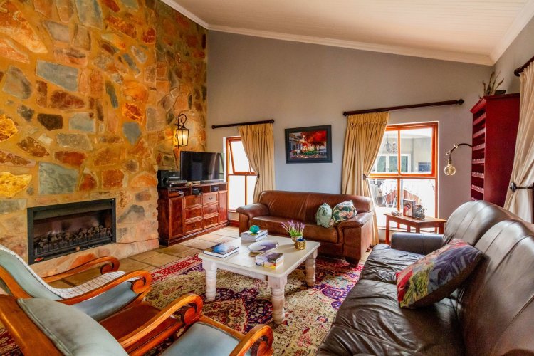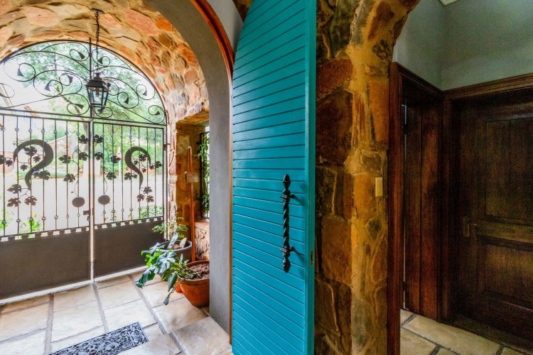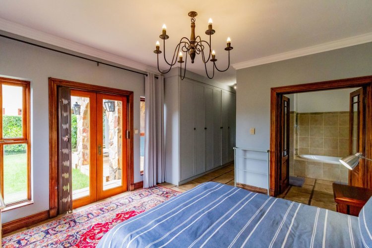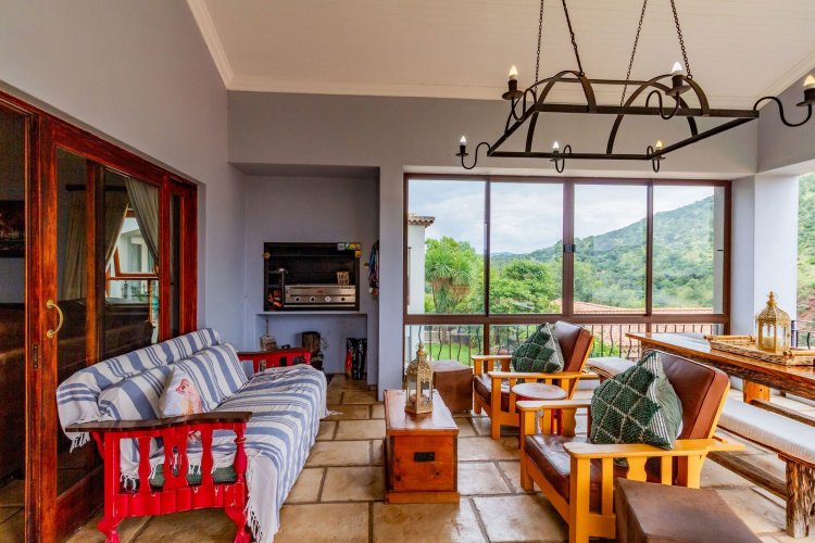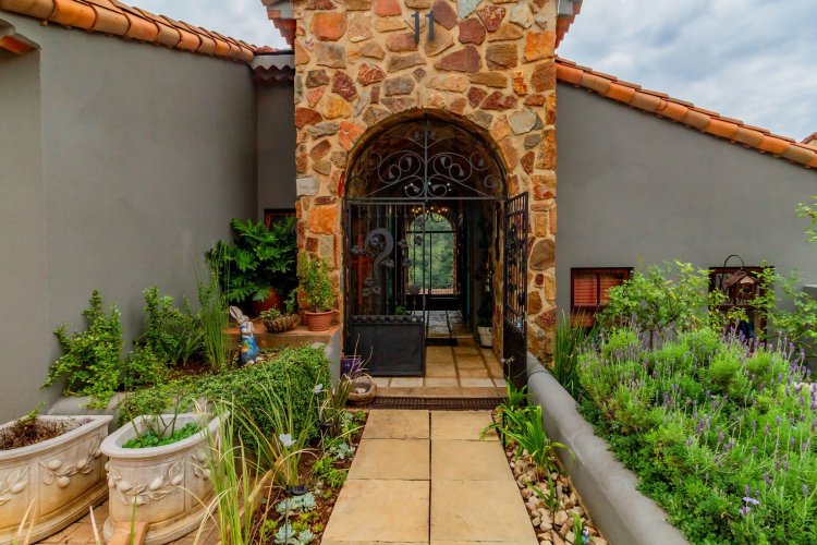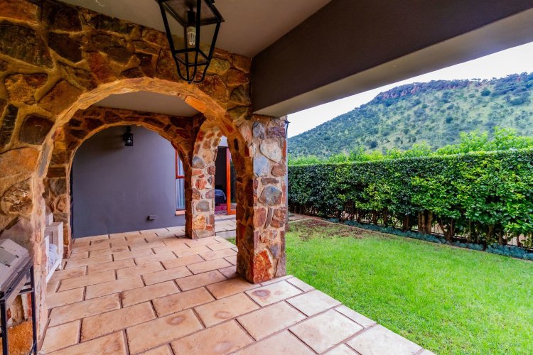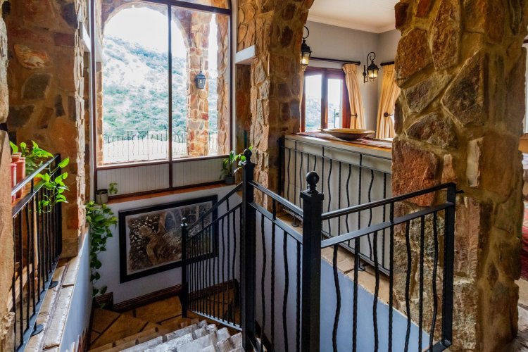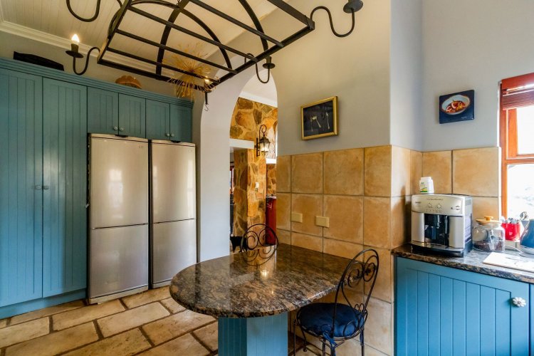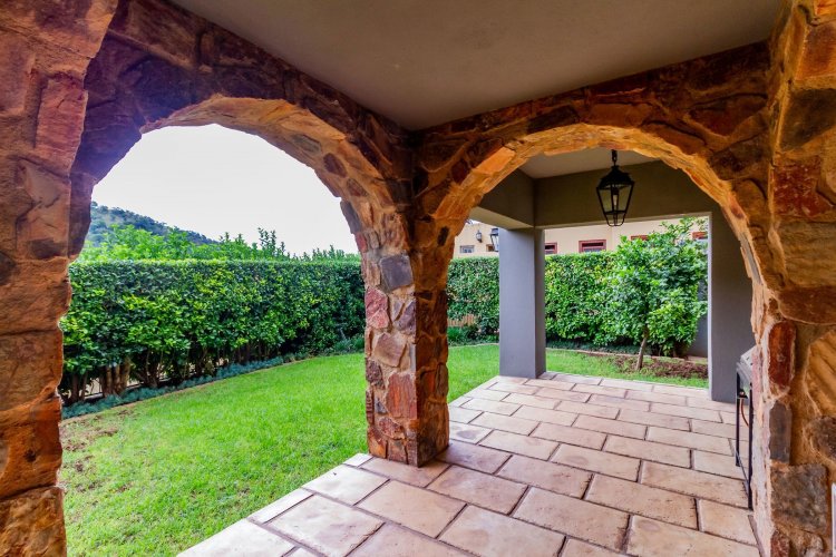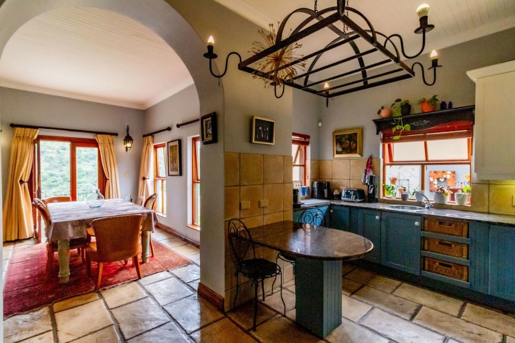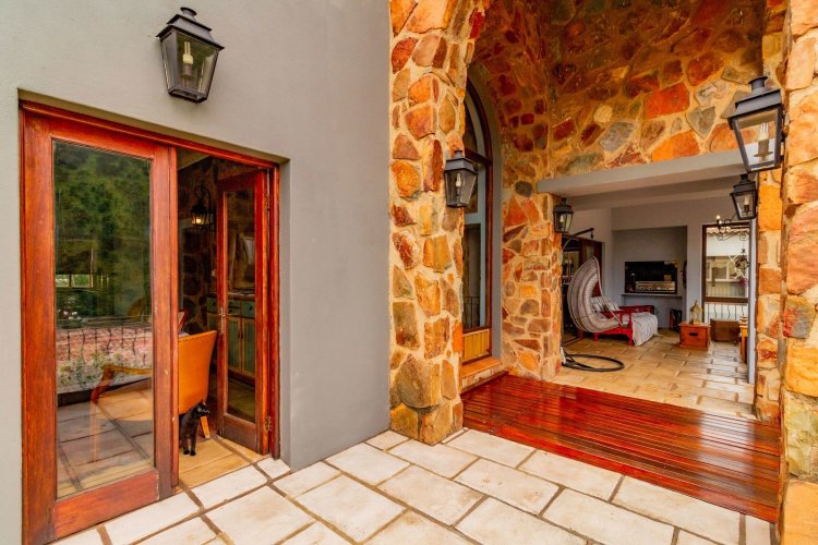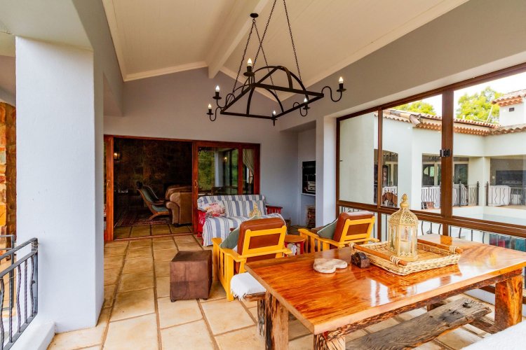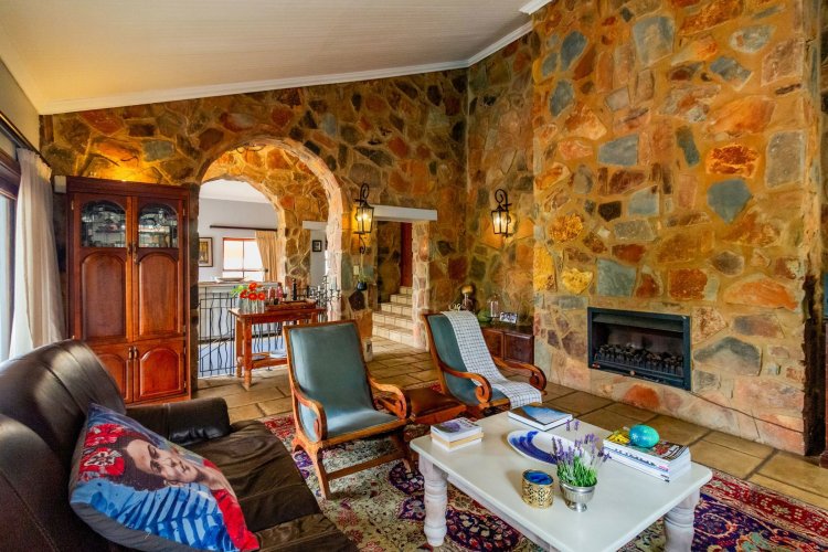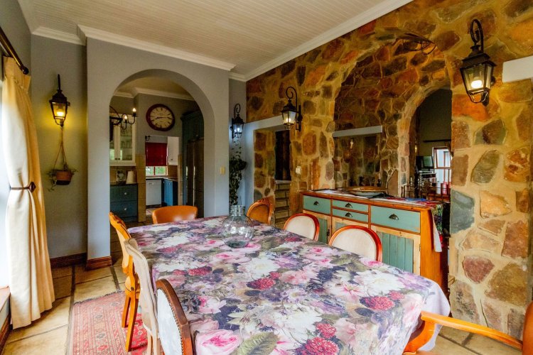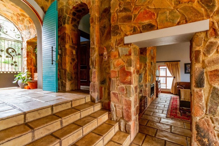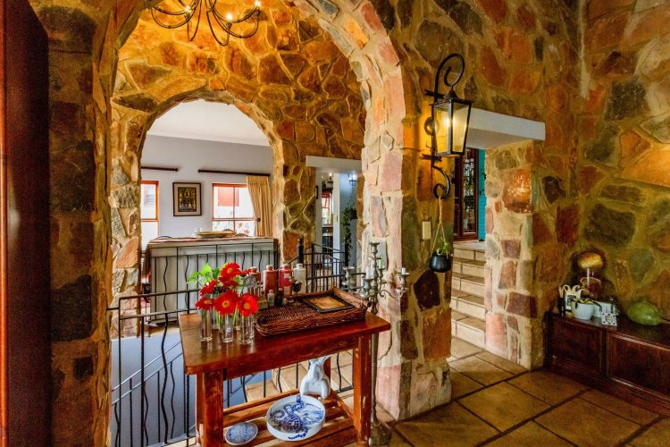 The charming entrance hall with stone arches leads onto an intimate living space with a gas fireplace, which flows out to a covered patio with a built-in braai and beautiful views, perfect for entertaining. Both dining and kitchen areas are positioned on the right and there is also a separate scullery. Additional features include a double garage and self-contained staff quarters.