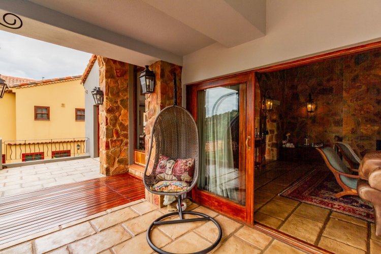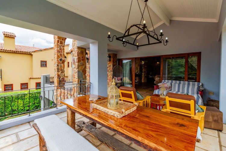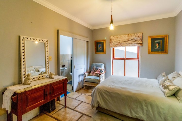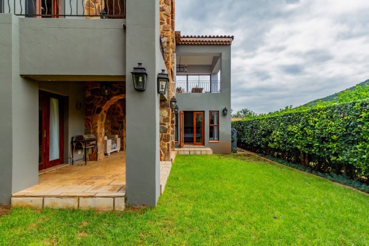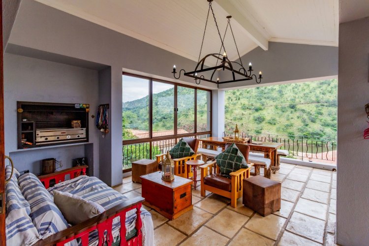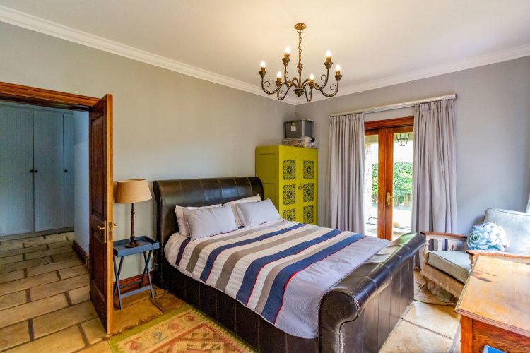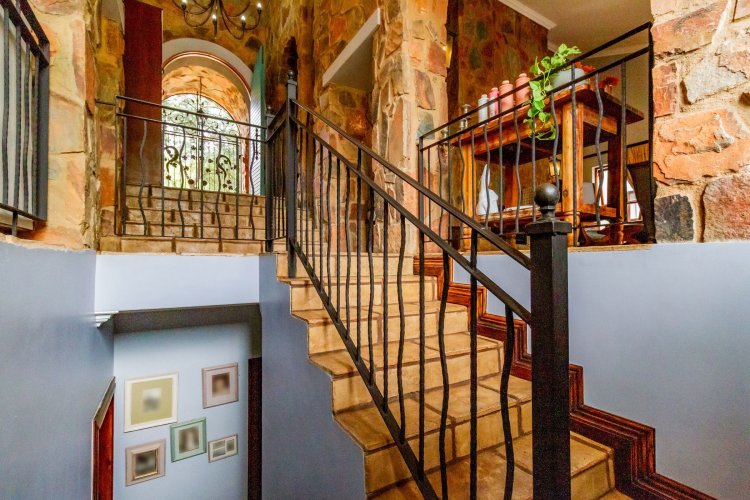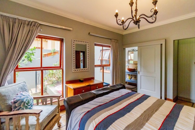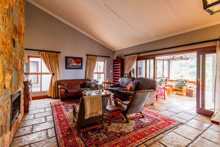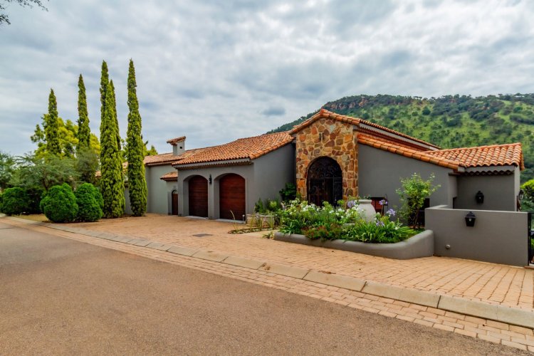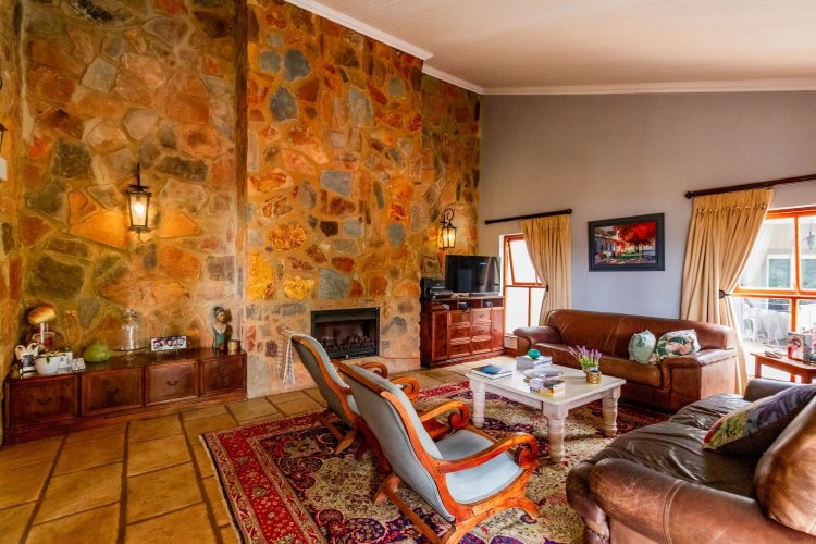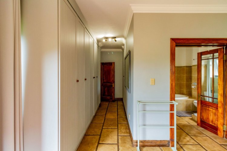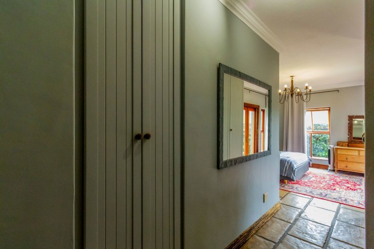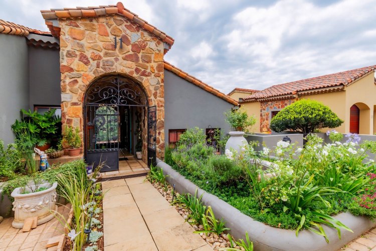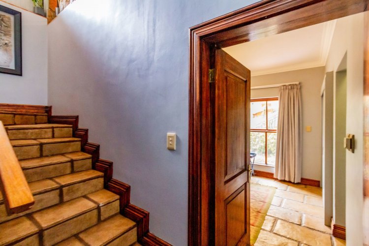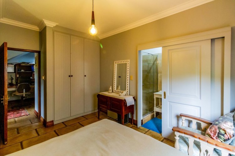 The charming entrance hall with stone arches leads onto an intimate living space with a gas fireplace, which flows out to a covered patio with a built-in braai and beautiful views, perfect for entertaining. Both dining and kitchen areas are positioned on the right and there is also a separate scullery. Additional features include a double garage and self-contained staff quarters.