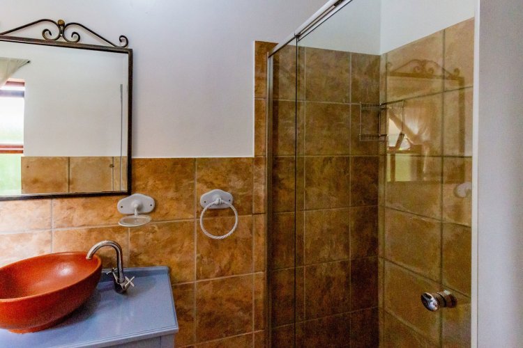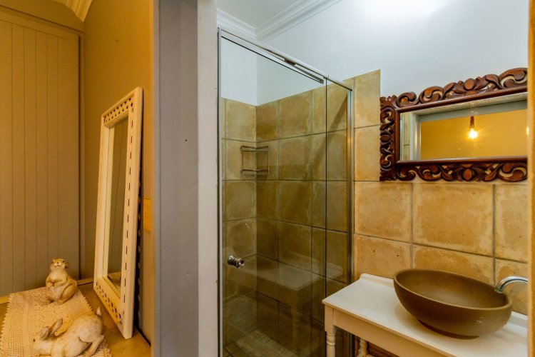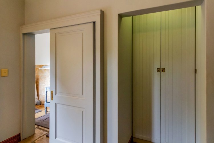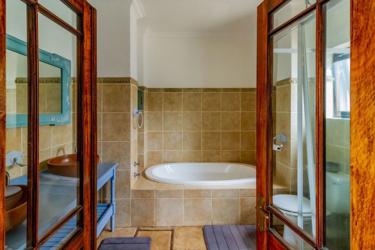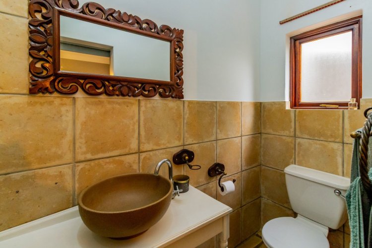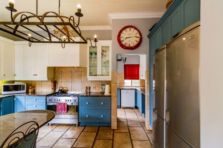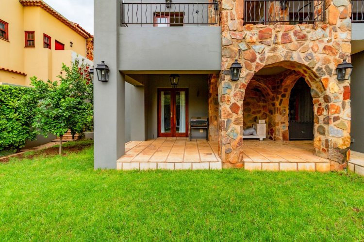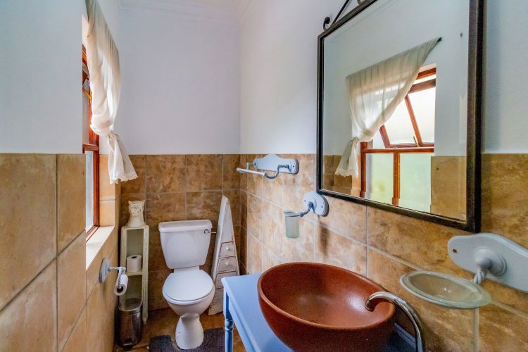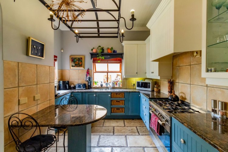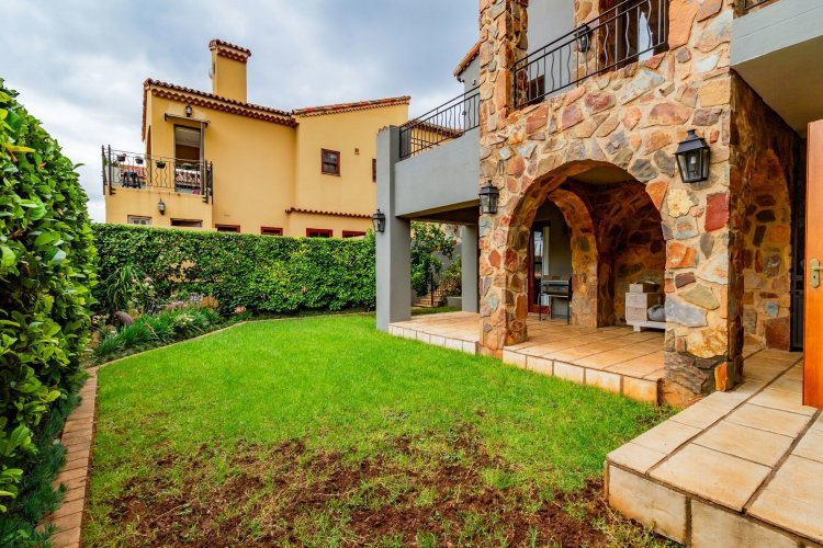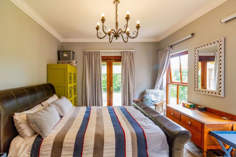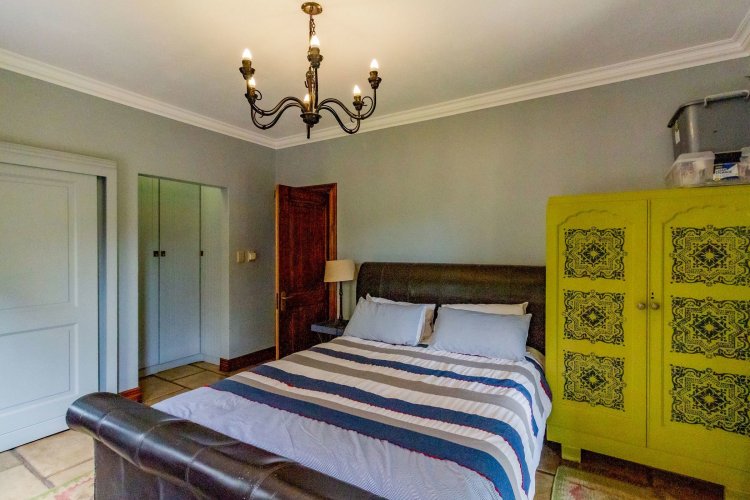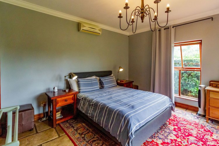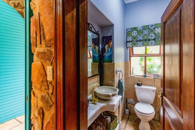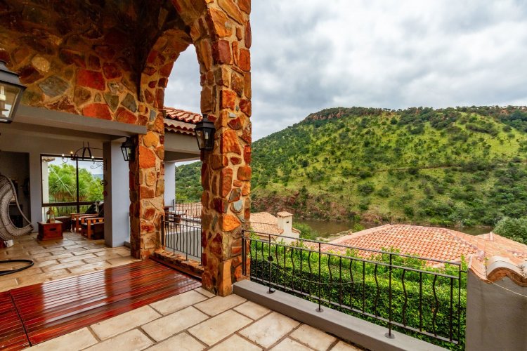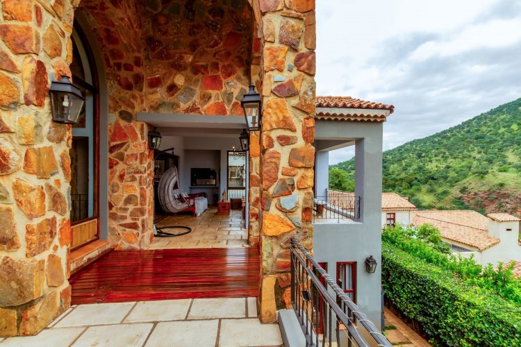 The charming entrance hall with stone arches leads onto an intimate living space with a gas fireplace, which flows out to a covered patio with a built-in braai and beautiful views, perfect for entertaining. Both dining and kitchen areas are positioned on the right and there is also a separate scullery. Additional features include a double garage and self-contained staff quarters.