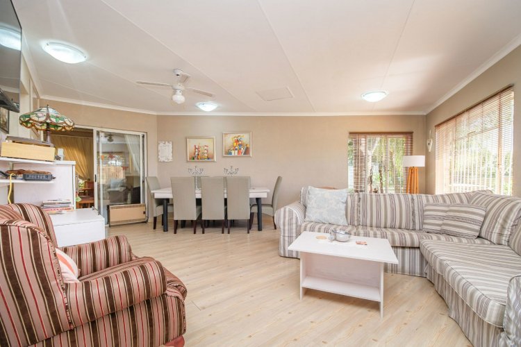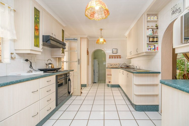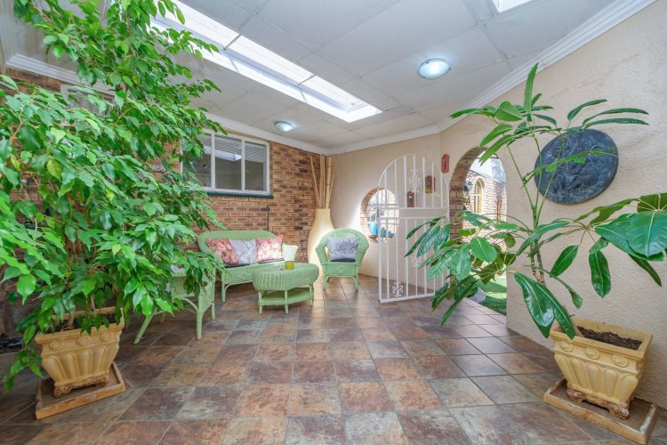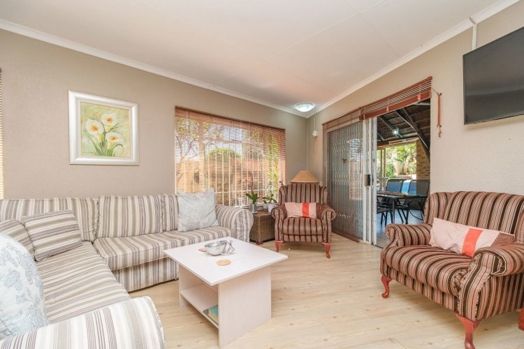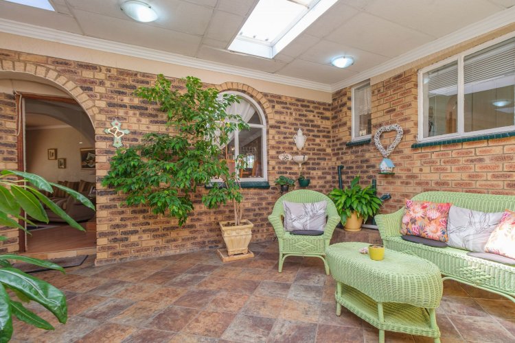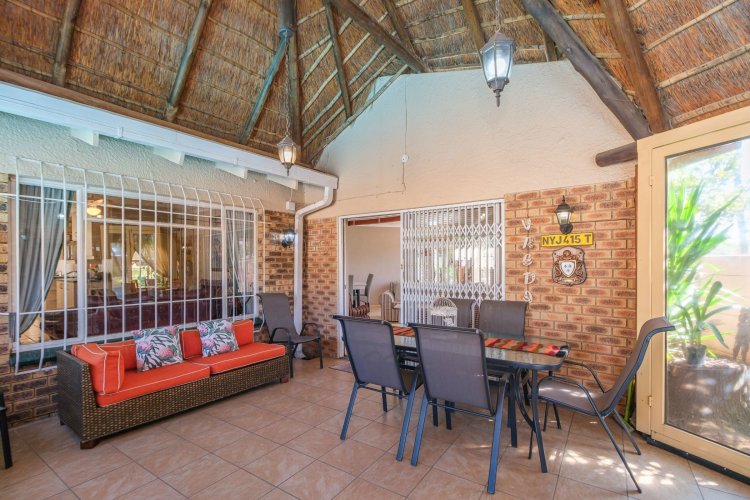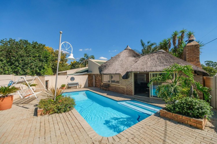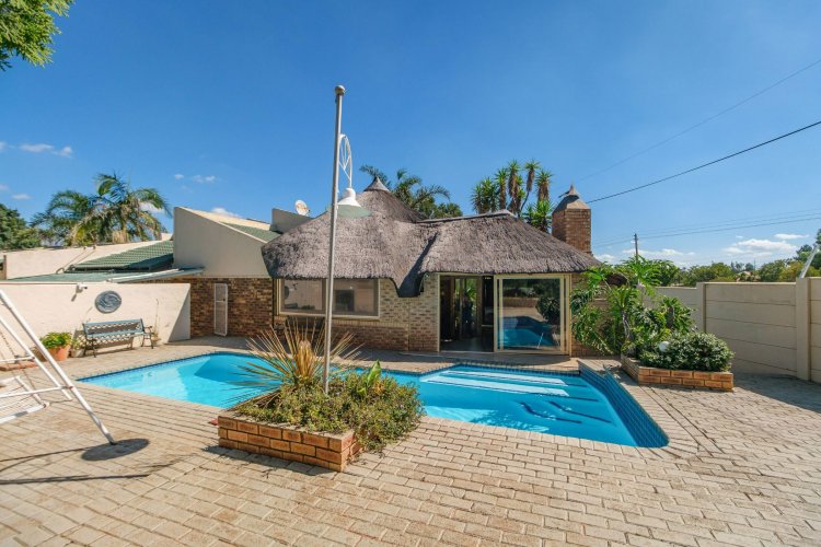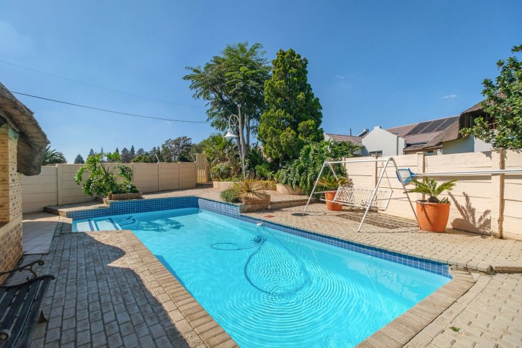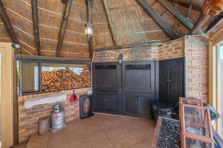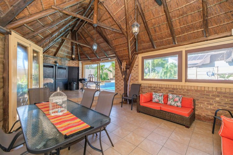 A major highlight is the thatch lapa, complete with a built-in braai, perfectly positioned to overlook a sparkling swimming pool. It's a dream setup for outdoor entertaining, summer braais, or simply unwinding after a long day.