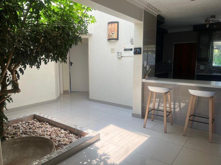 Step inside to an impressive entrance hall featuring a large skylight that fills the space with natural light and highlights an indoor atrium complete with a charming water feature. The modern, open-plan kitchen is fitted with Caesarstone countertops and provides space for a large fridge/freezer combo. It flows seamlessly into the dining area, which includes a cosy fireplace—perfect for family meals and gatherings.