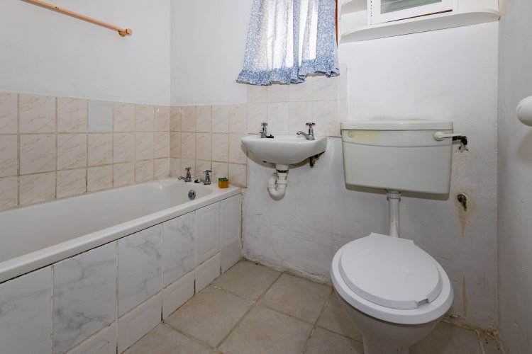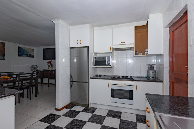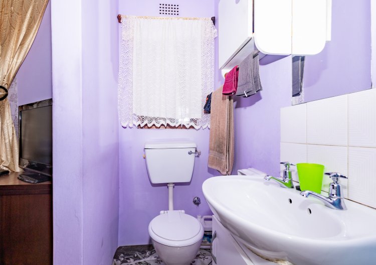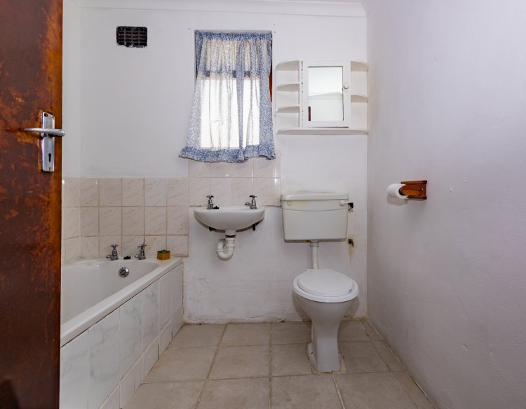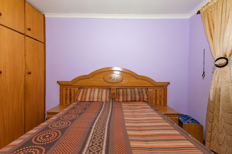The main house boasts two large bedrooms, with the master bedroom complete with an en-suite bathroom, as well as a family bathroom. The kitchen is generously sized, open plan, and equipped with ample built-in cupboards. The two expansive living areas are tiled, offering the possibility of converting one into a third bedroom or office.