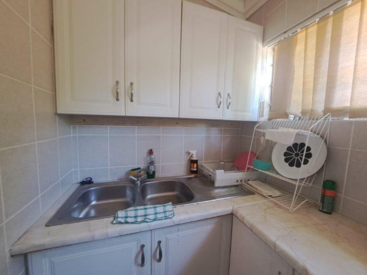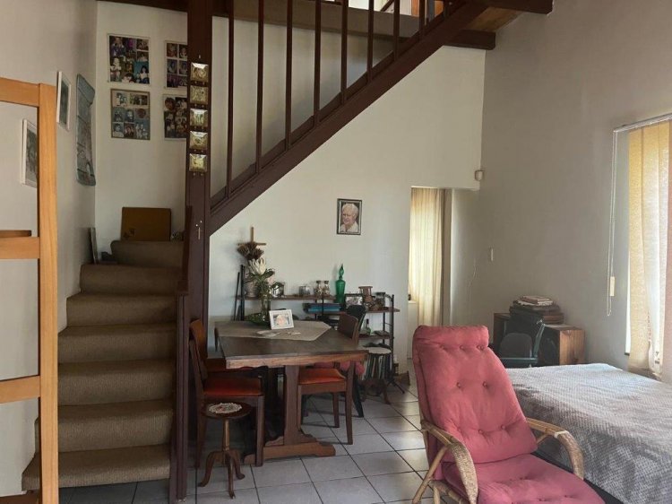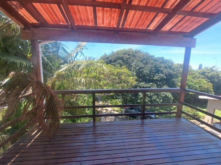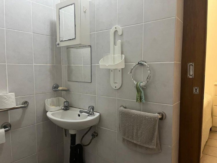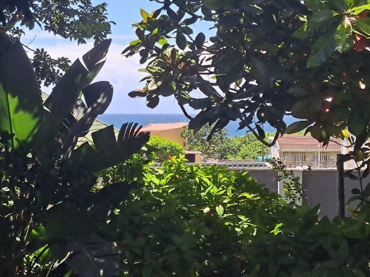 A separate, spacious double-storey two-bedroom flat with two attached garages is situated close to the main house. The ground floor offers an open-plan living area and a bedroom with an en-suite bathroom with a shower. There is a separate kitchen fitted with cupboards (no stove). A wooden staircase leads upstairs to an additional bedroom and living area with an en-suite bathroom. The upstairs living area opens onto a small balcony overlooking mature trees with partial sea views.