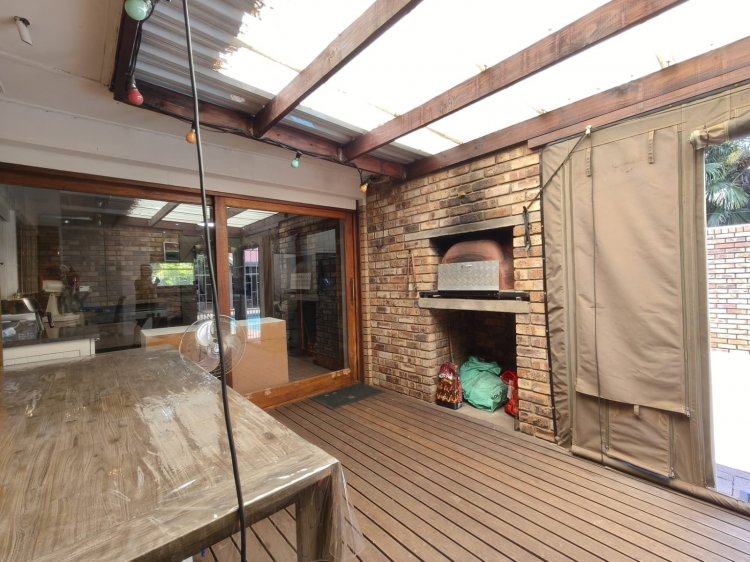 Step outside to the large covered patio with a built-in braai, an ideal space for entertaining guests or enjoying relaxed family evenings. This area overlooks a landscaped garden, heated swimming pool and an outside entertainment room with a built-in pizza oven, creating the perfect setting for outdoor living, kids’ playtime, summer fun and entertaining.