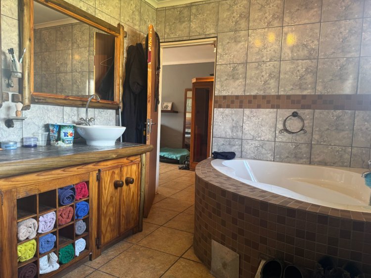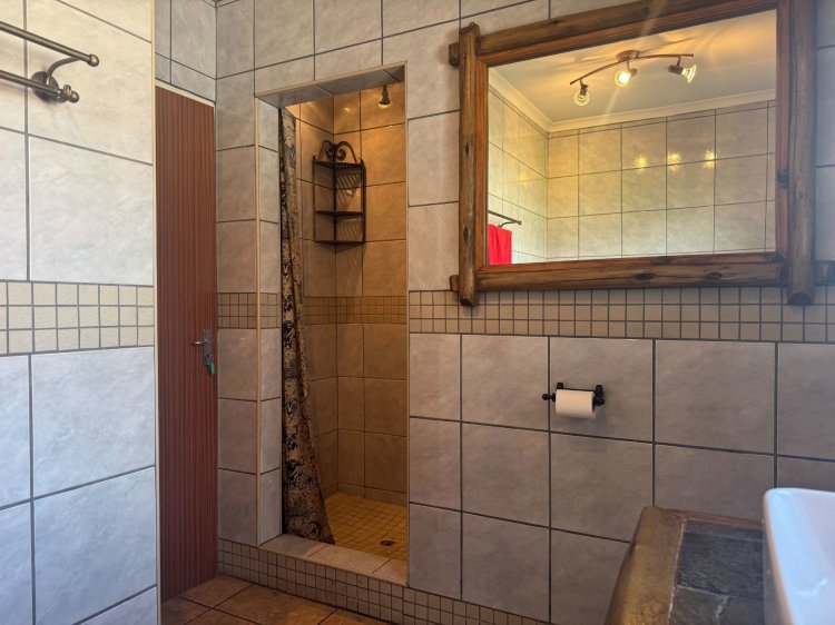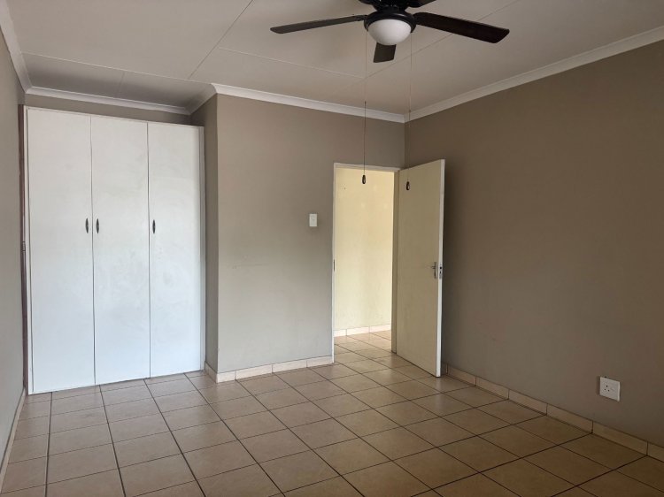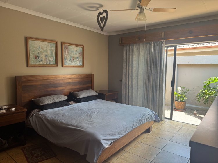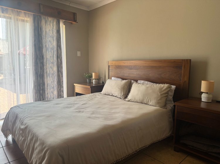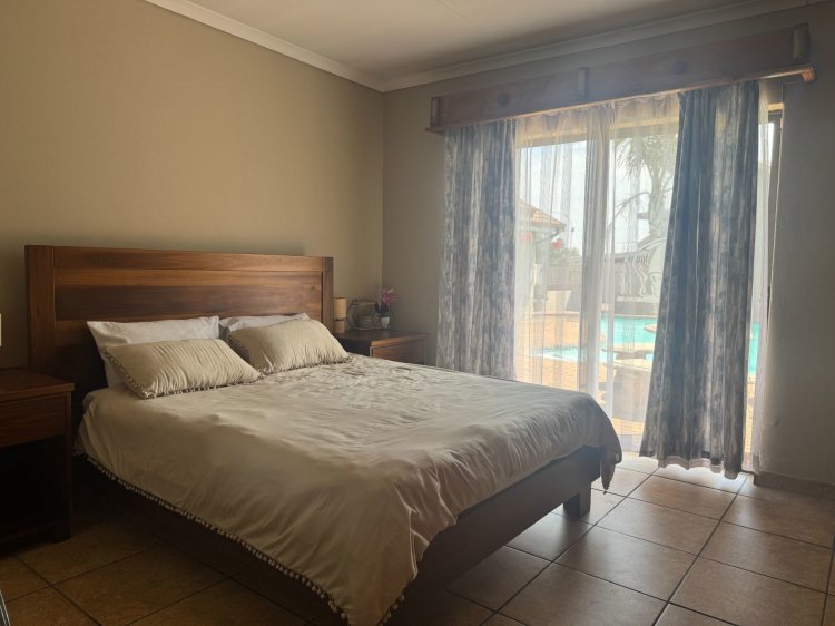 The main residence features three spacious bedrooms, each opening with sliding doors onto the pool area, creating seamless indoor-outdoor flow and an abundance of natural light. The main bedroom enjoys a full en-suite bathroom, complemented by a second full family bathroom. Tiled flooring throughout ensures low maintenance, while warm wooden built-in cupboards add character and ample storage. A large hallway linen cupboard, as well as dedicated space for a washing machine, enhances everyday functionality.