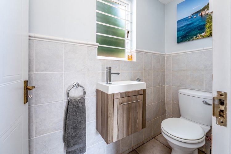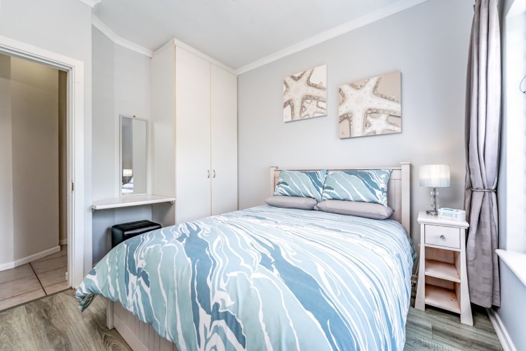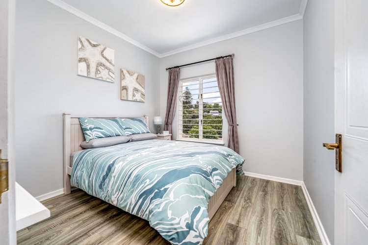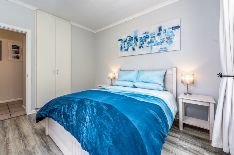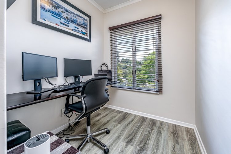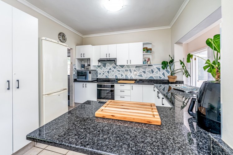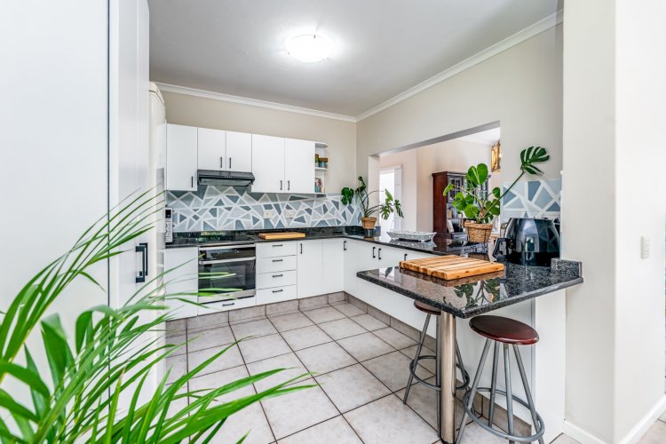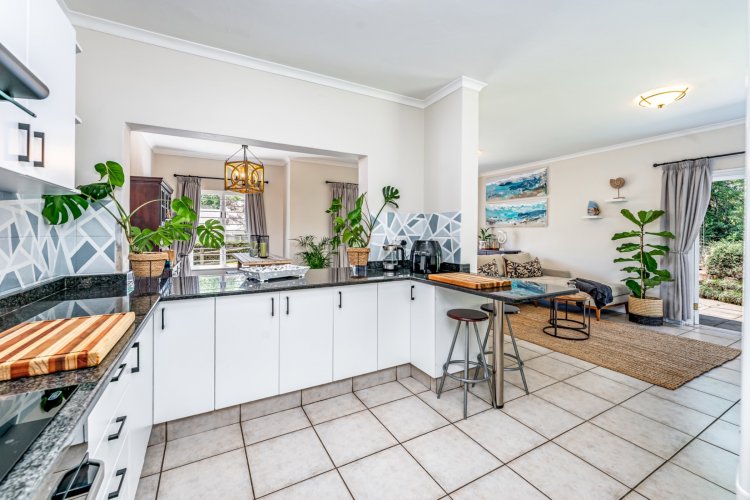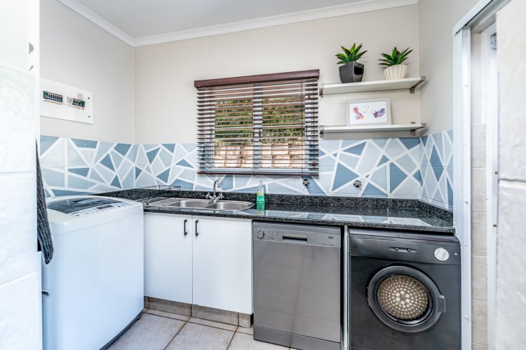 The modern kitchen is fitted with granite countertops and a separate scullery, fully plumbed for a dishwasher, washing machine, and tumble dryer, and leads to an enclosed courtyard. All three bedrooms are finished with laminate flooring, while the living areas are elegantly tiled for easy maintenance.