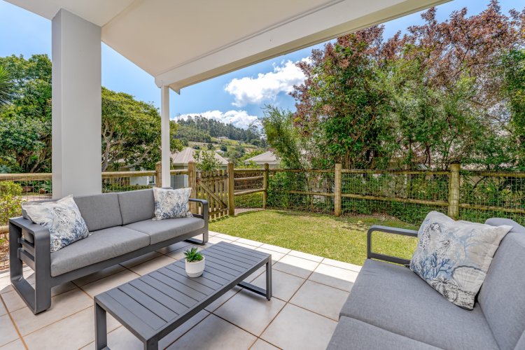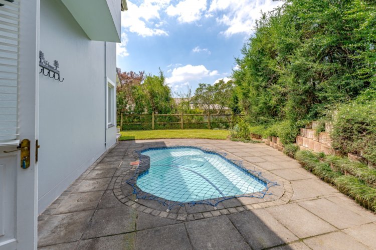 The home features a spacious open-plan layout that seamlessly connects the kitchen, dining, and lounge areas. French doors open onto a covered patio overlooking a private splash pool — ideal for entertaining or relaxing with family.