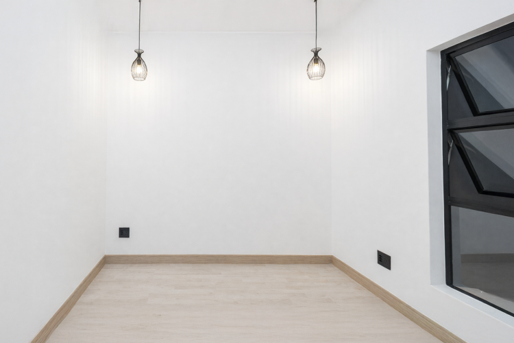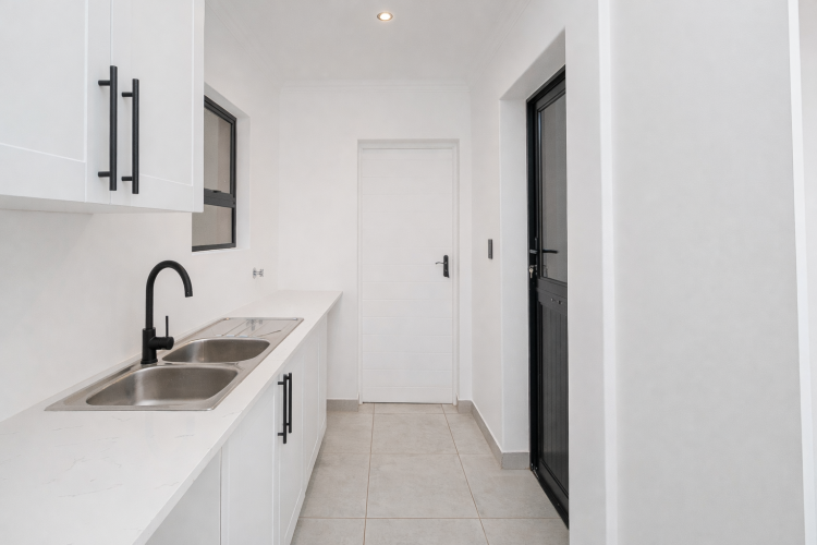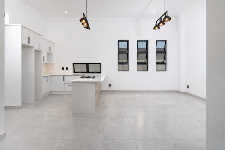 The home features a spacious open-plan layout with exposed trusses that enhance natural light and create a contemporary, tenant-friendly living environment. The kitchen flows seamlessly into the dining and living areas, offering a practical configuration that appeals to both long- and short-term tenants. Finished with quality cabinetry, modern finishes and a separate scullery, the kitchen is designed for durability and ease of use.