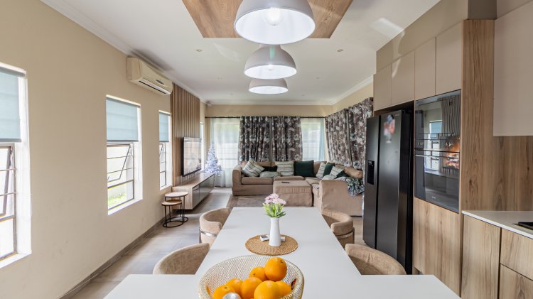 The heart of the home is the open-plan, air-conditioned lounge, seamlessly flowing into a modern kitchen fitted with a gas hob, eye-level oven, and integrated microwave—perfect for both everyday living and hosting guests. Step outside to a covered patio with built-in braai, overlooking a private and pet friendly garden that provides a relaxed space for outdoor enjoyment.