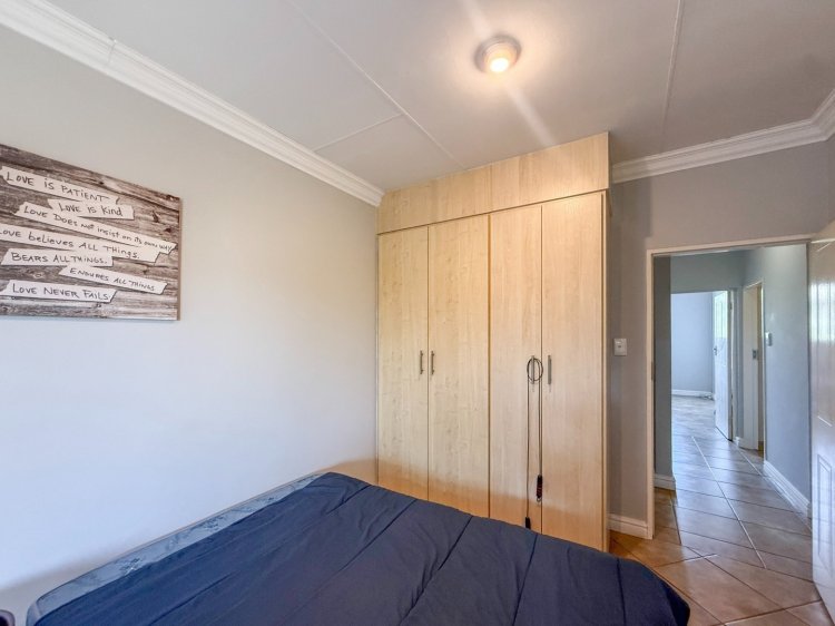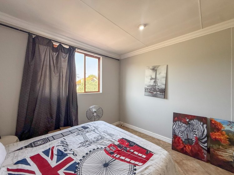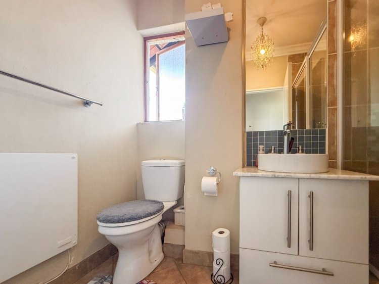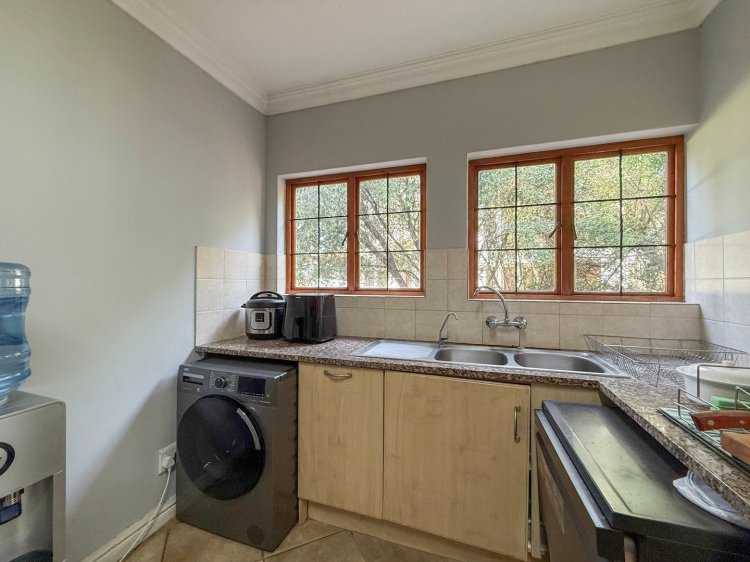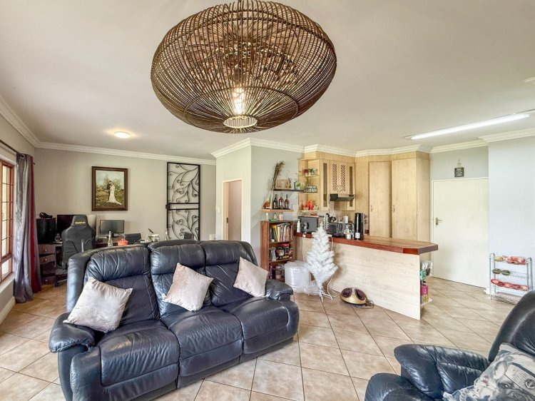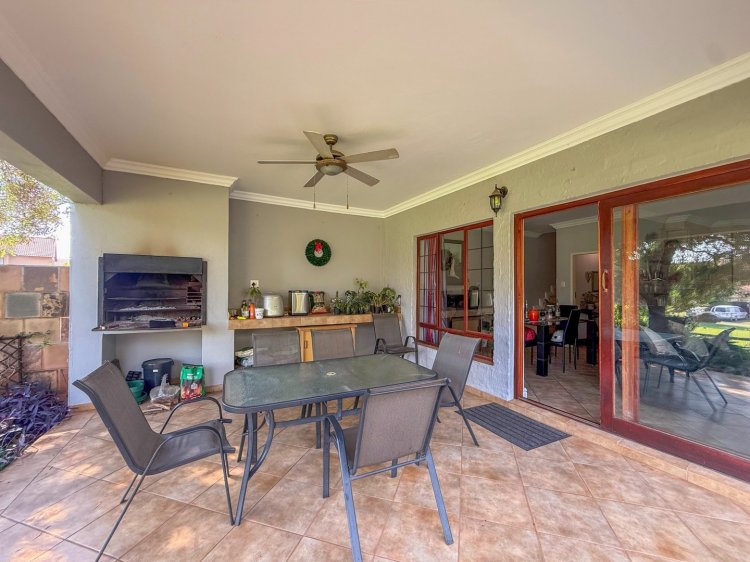 The interior layout is practical yet welcoming, featuring three well-sized bedrooms and two and a half bathrooms, including a main en-suite. The open-plan living and dining area creates an easy sense of connection, anchored by a well-equipped kitchen with a gas hob and generous storage. Seamless indoor-outdoor living is achieved through a covered patio with a built-in braai, ideal for relaxed entertaining or enjoying peaceful afternoons at home. A solar system with eight panels further enhances the appeal, offering energy efficiency and reduced running costs. , Additionally this home is equipped with dedicated staff accommodation, adding further convenience.