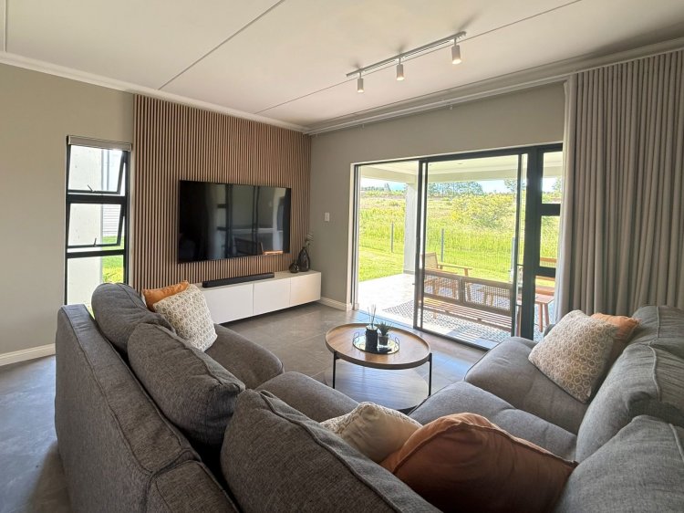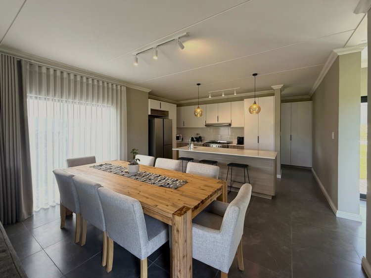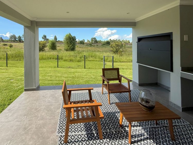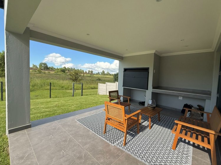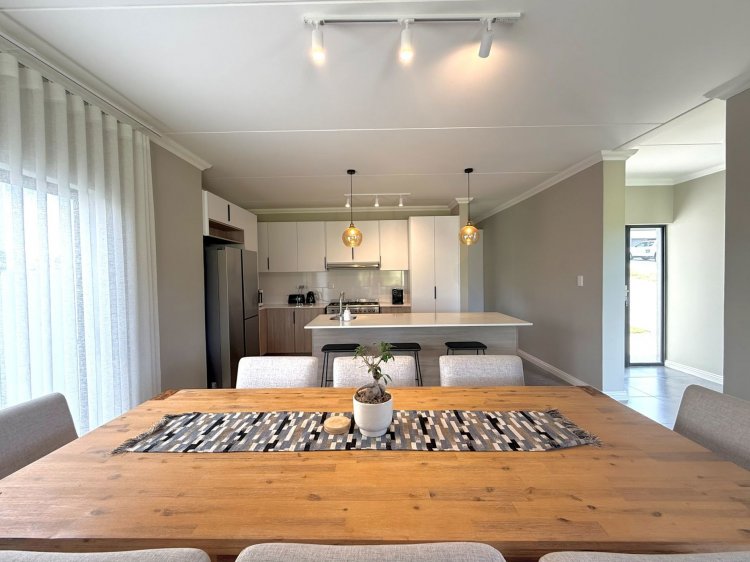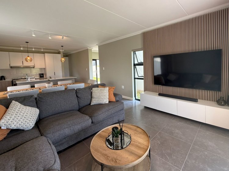 The dining area comfortably accommodates a spacious dining table. The kitchen is well appointed and features a prep bowl, space for bar stools, and space for a double-door fridge. A separate scullery provides additional storage and space for two appliances. The lounge boasts a beautiful wood feature wall behind the TV, complete with a built-in cabinet, and opens onto a spacious covered patio with a built-in braai.