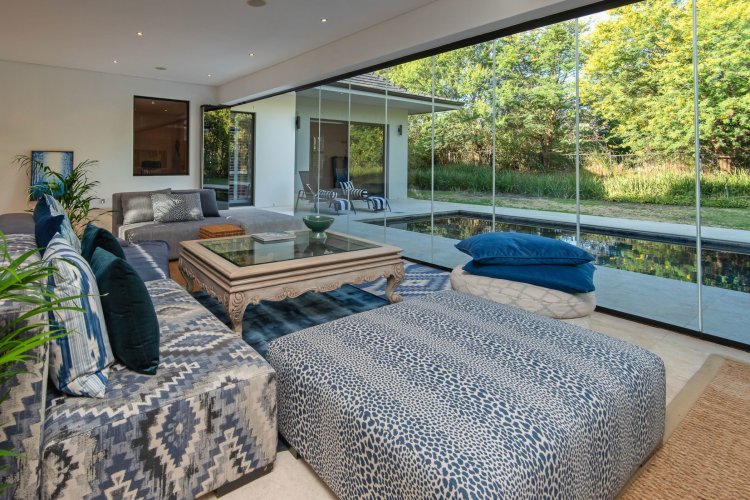 The spacious indoor braai room is designed for year-round enjoyment and includes a jacuzzi. Tinted glass stacking doors open onto the pool, offering uninterrupted views towards the 10th fairway.