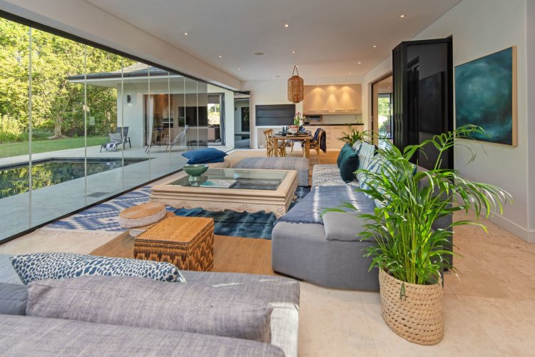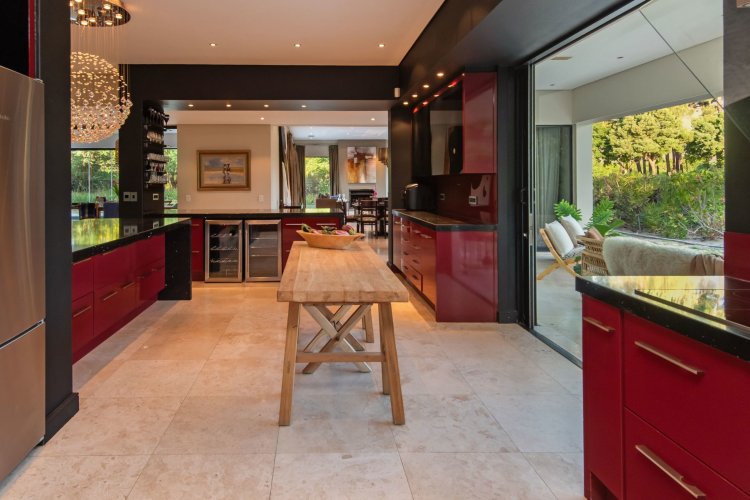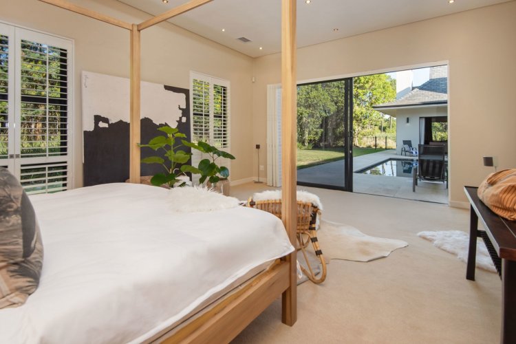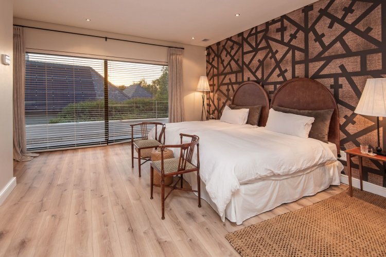 From the moment you step inside, the home's high ceilings and thoughtful design create an immediate sense of openness. The open plan living and dining area flows seamlessly into a well-appointed kitchen, complete with a centre island, breakfast nook, ample cupboard space, and a separate scullery for added convenience. Expansive sliding doors draw in natural light and open directly onto the garden and lake, framing immaculate views across the water and golf course.