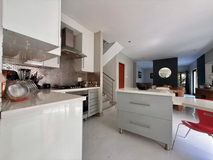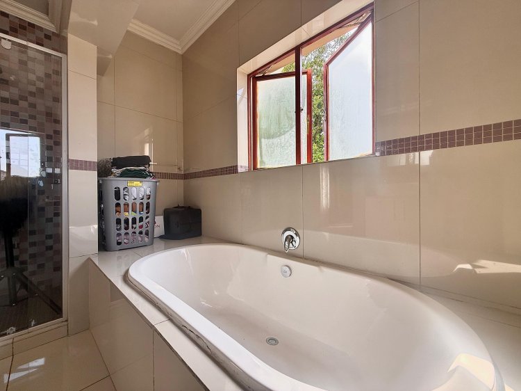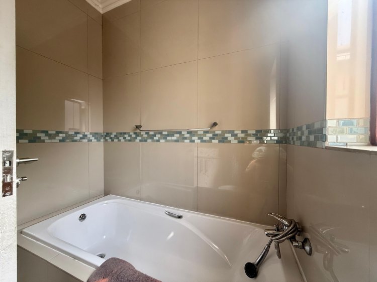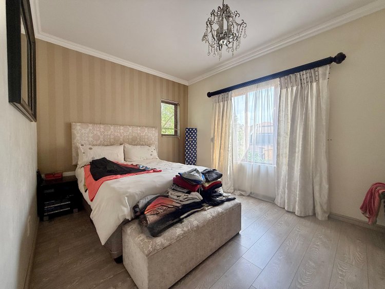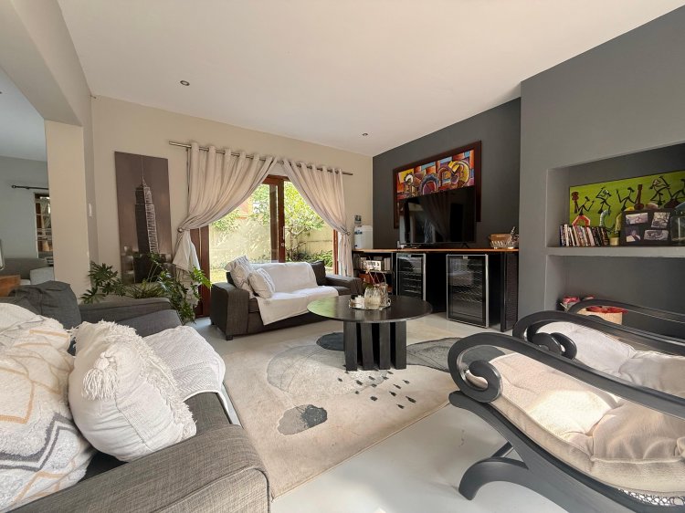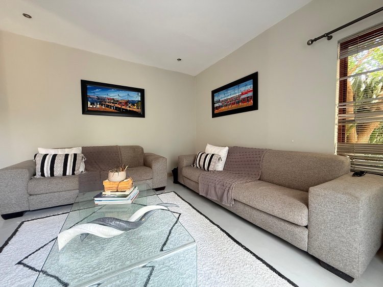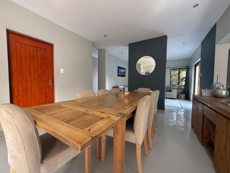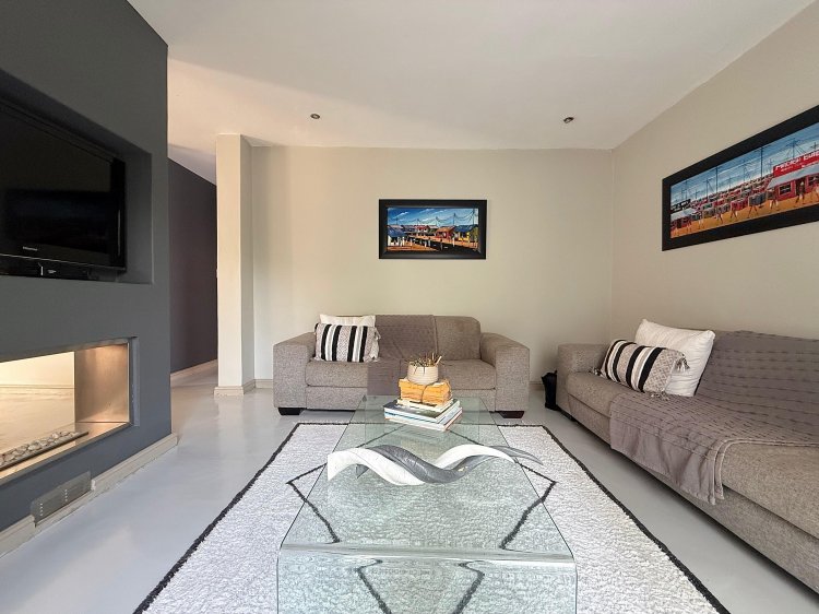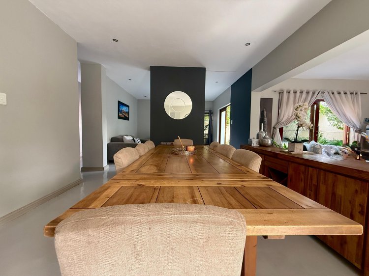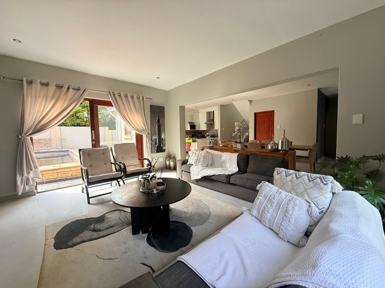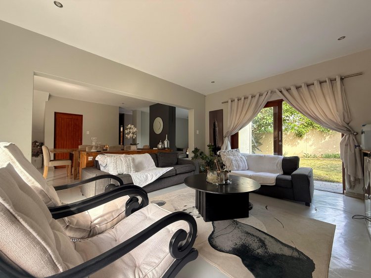 This elegant 4-bedroom home is thoughtfully designed for family life, offering generous spaces and contemporary finishes throughout. The modern kitchen, complete with a separate scullery, flows seamlessly into the open-plan dining and TV lounge areas – perfect for easy entertaining or relaxed evenings at home. Large sliding doors open onto the patio, overlooking a sparkling pool and manicured garden that invite year-round outdoor enjoyment.