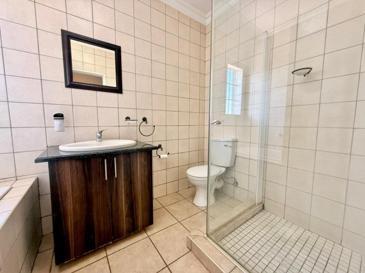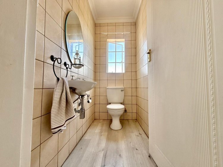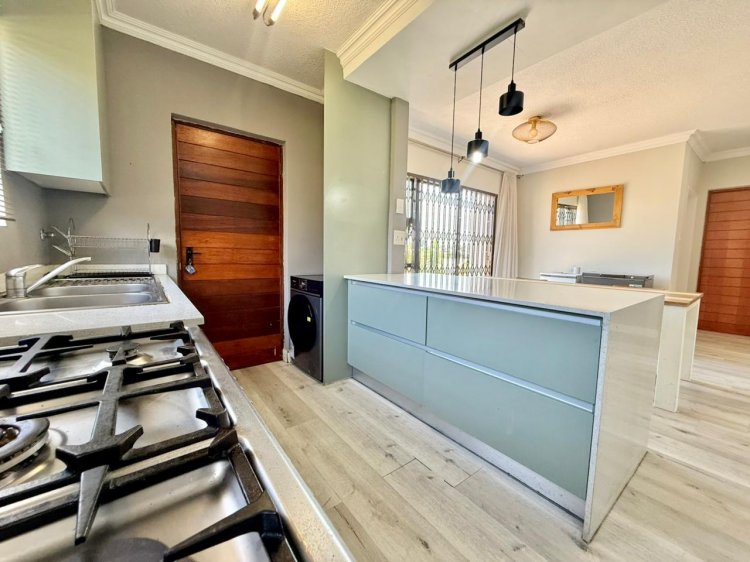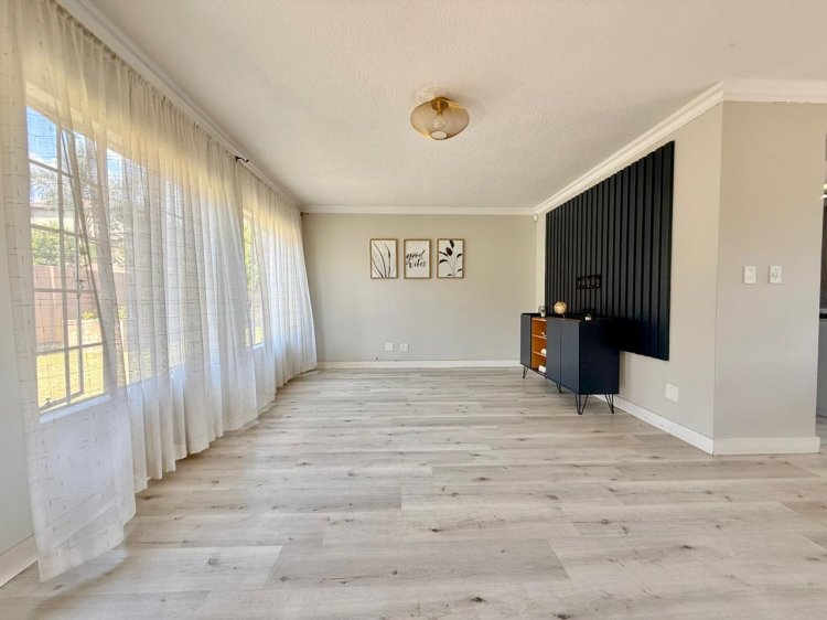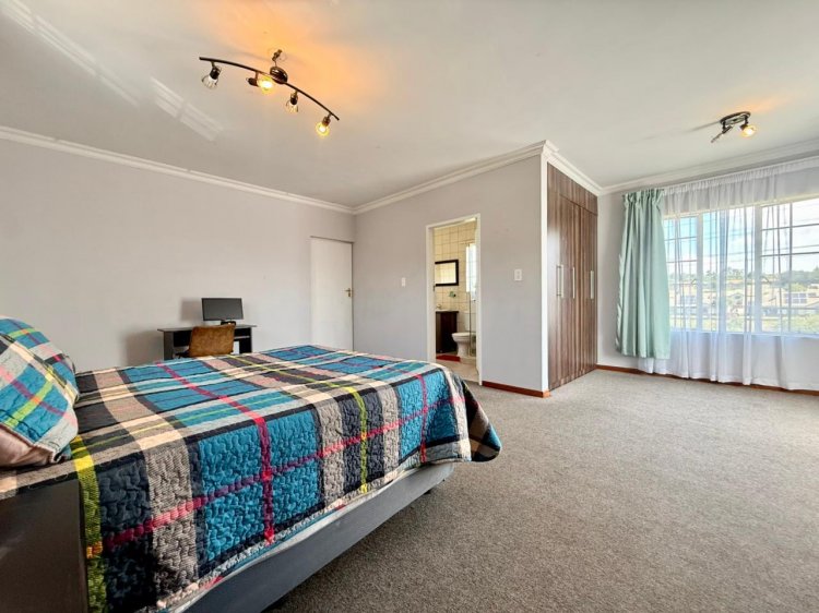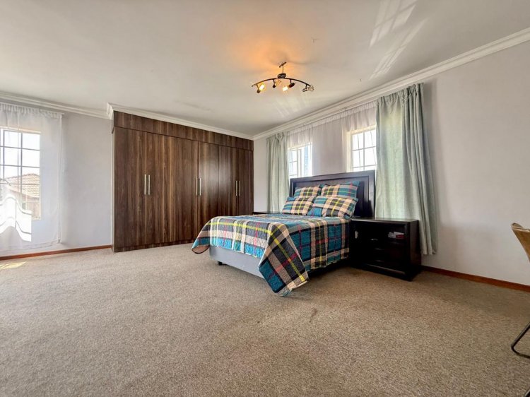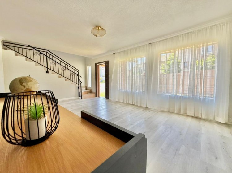 Step into this spacious and well-designed four-bedroom family home that offers comfort, functionality, and excellent entertainment space. Upon entering through the gate, you are welcomed by ample parking. The front entrance opens into a bright and generously sized living room, filled with natural light. Adjacent to the living area is a dining room that enjoys peaceful views of the garden and the surrounding estate. The kitchen is thoughtfully laid out with space for a fridge and two additional appliances, and is fitted with a gas stove, making it both practical and efficient. Downstairs also features a guest bathroom, a versatile storage room ideal for use as a pantry or additional storage, and direct access to the garage. Upstairs, security gates are fitted at the stairway entrance, and a linen cupboard adds extra convenience. Three well-sized bedrooms offer ample cupboard space and good natural lighting, sharing a full bathroom. The master bedroom is spacious, featuring plenty of built-in cupboards, excellent natural light, and a private en-suite bathroom. The large garden is perfect for hosting and family living, complete with a spacious patio, a jungle gym for children, a washing line, and a Wendy house that will remain on the property.
