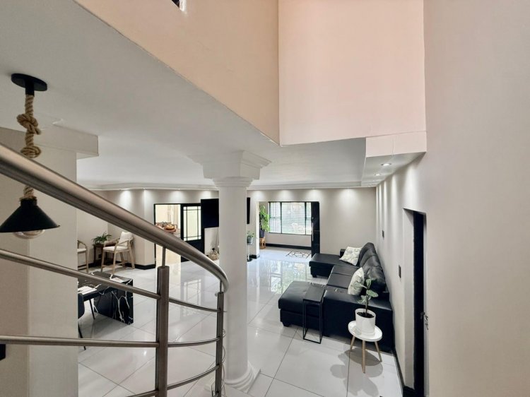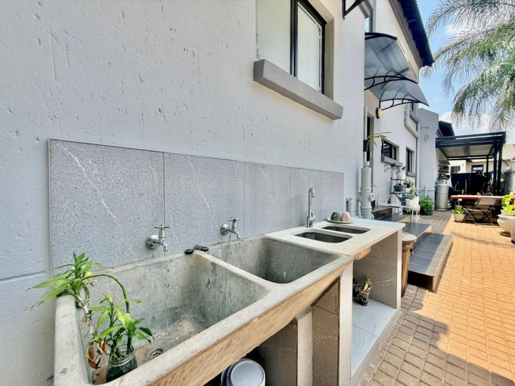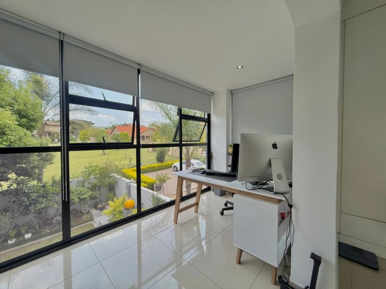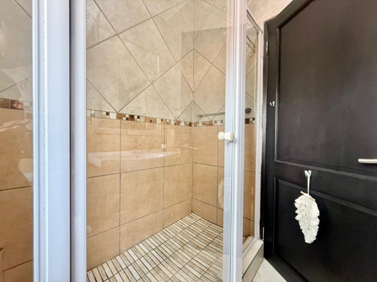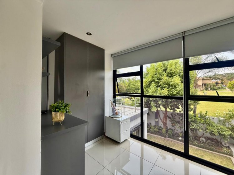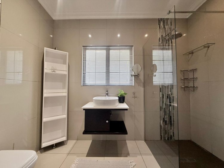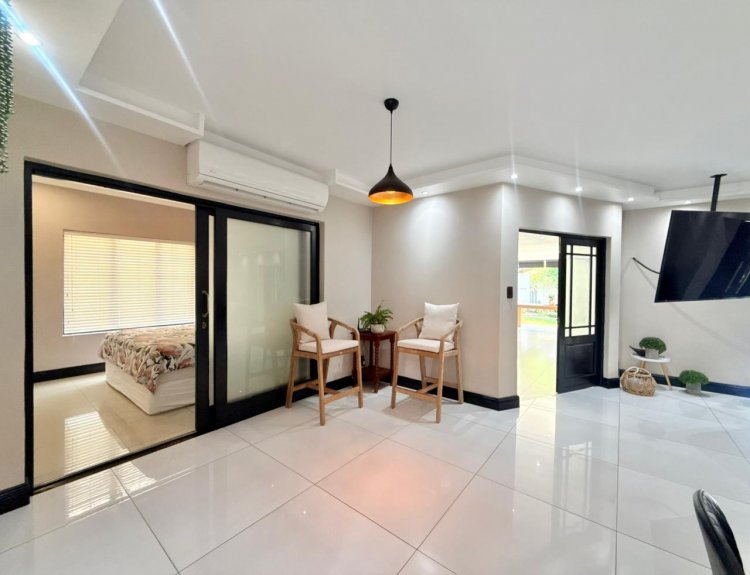 The expansive open-plan living area offers excellent flow and functionality, providing access to a guest bedroom or fourth bedroom complete with its own bathroom. This level also features a spacious, enclosed entertainment area fitted with a built-in braai and bar—perfect for hosting and entertaining. Stack doors open this space directly onto the garden, creating effortless indoor-outdoor living. A conveniently located guest toilet completes the ground floor.