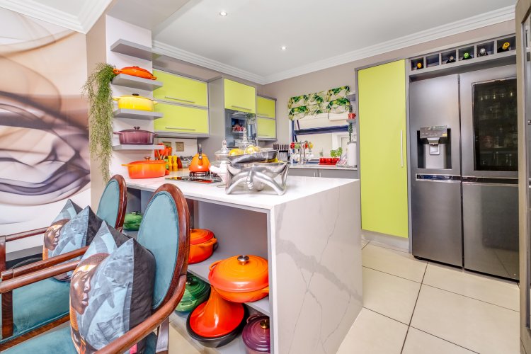 The kitchen, the true heart of the home, balances elegance with practicality. Sleek cabinetry and Caesarstone countertops frame a freestanding gas stove, while a separate scullery ensures that every detail of daily living is effortless. It is a space designed not just for cooking, but for connection — where meals become memories and conversations linger long after the plates are cleared.