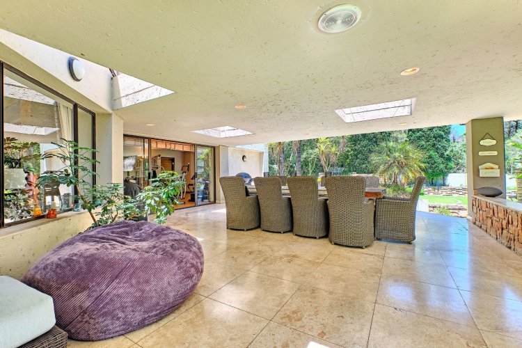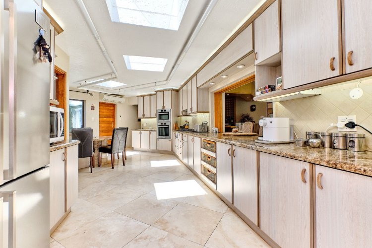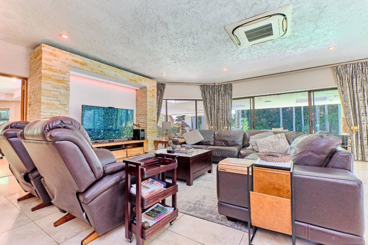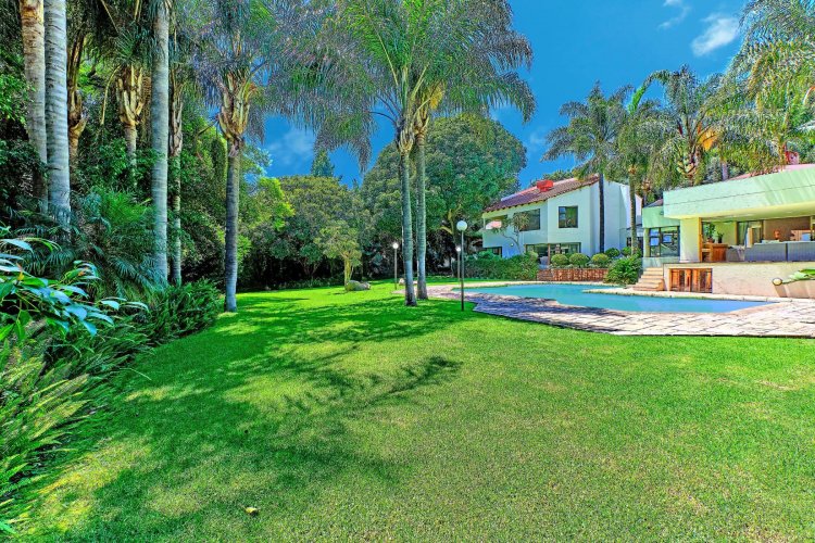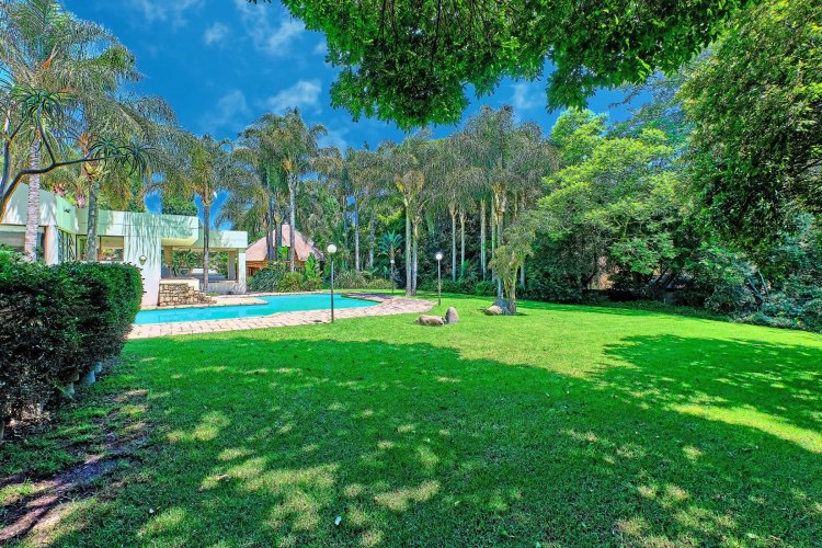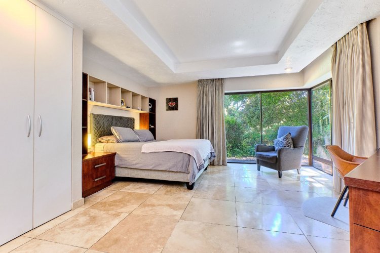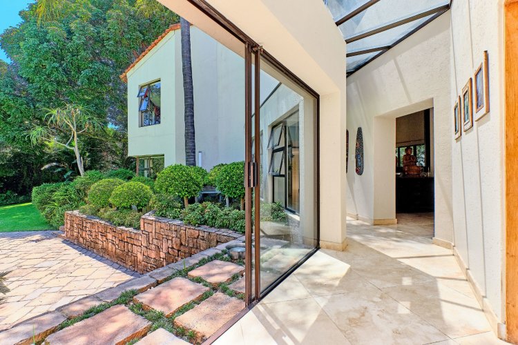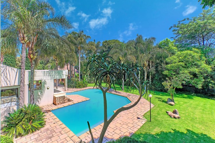 This exquisite residence in Bryanston East offers the ultimate in luxury and tranquillity, set within a secure boomed and gated enclave. Designed with a resort-like ambiance, the home features expansive open-plan living spaces, enhanced by glass passageways and atriums that connect seamlessly to a manicured, low-maintenance landscaped garden framed by mature trees, including stately palms. The main house spans approximately 1,000m² under roof and comprises: 1. 4 en-suite bedrooms , each with garden access, plus a study and TV/media room – all finished with elegant travertine tiles. 2. A luxurious main suite with walk-in dressing room and a private patio overlooking the serene garden. 3. A fully fitted granite kitchen with breakfast bar, gas hob, electric oven, and adjoining scullery/laundry. 4. Ducted air-conditioning and expansive skylights that bathe the interiors in natural light. 5. A mirrored gym with twin showers , ideal for at-home workouts. 6. An impressive covered patio (±80sqm) leading to the swimming pool and rim-flow undercover Jacuzzi. Additional features include: 1. A renovated guardhouse converted into a luxury home office with en-suite shower. 2. A self-contained domestic flatlet. 3. A second garden dwelling , ideal as offices or an entertainer's haven, complete with lounge, games room, cigar lounge, cocktail area, kitchen, bathroom, bedroom, and wine cellar. Energy & Water Systems – Fully Off-Grid 1. Solar System: 1. Grid-tied with battery + inverter backup (50–80kWh/day). 2. 3-Phase Deye 12kW inverter. 3. 3 x 5kW Volta Stage 1 batteries (expandable to 30kW). 4. 30 x 600W PV panels (18kW real-time generation). 5. Seasonal solar generation averages available on request. 2. Water System: 1. 100% off-grid borehole supply (switchable to municipal if required). 2. 10,000L water tank with variable pressure pump. 3. Supplies both dwellings and irrigation. 4. Full filtration system including UV, softener, pH balancer, and pipe protection. 3. Geysers: 1. 4 geysers in total, all fitted with Geyserwise controllers. 2. Bedroom geysers: Gas (2 x 48L) and/or solar/photovoltaic/grid-tied. 3. Kitchen geyser: Solar and/or photovoltaic/grid-tied. 4. Cottage geyser: Solar and/or photovoltaic/grid-tied. Additional Highlights • Bosch 90cm glass-top gas stove/hob. • Three garages plus three covered parking bays, set at the end of a sweeping driveway. • Drop-off zone at entrance, ideal for guests in inclement weather. • Automated irrigation with dual zones. • State-of-the-art security with smart-controlled access, alarm, and floodlit garden. • Re-waterproofing of all flat roof areas. 1. New concrete screed to driveway entrance gate. 2. Full exterior repainting. 3. Refurbishment of all woodwork (windows, cottage doors, garage doors). 4. Upgraded lighting to garden and selected interiors.