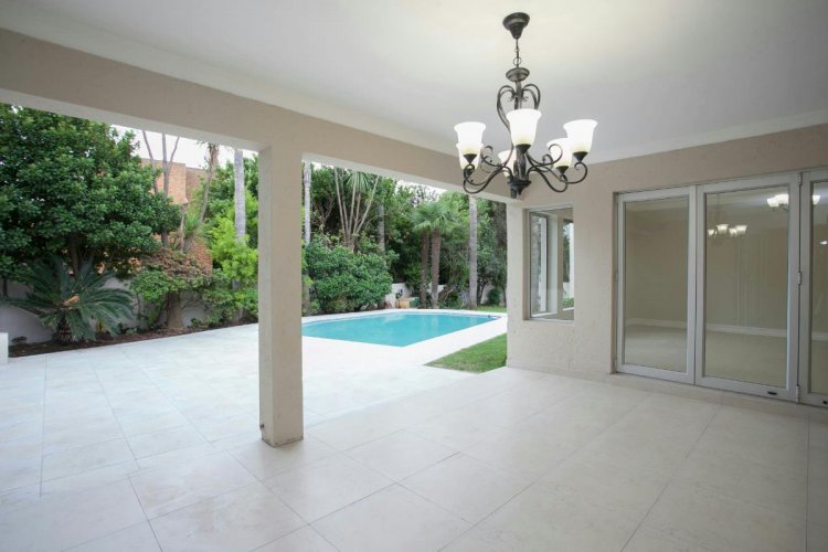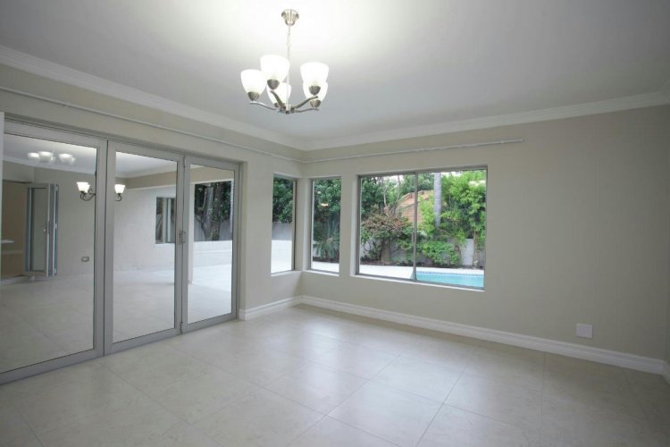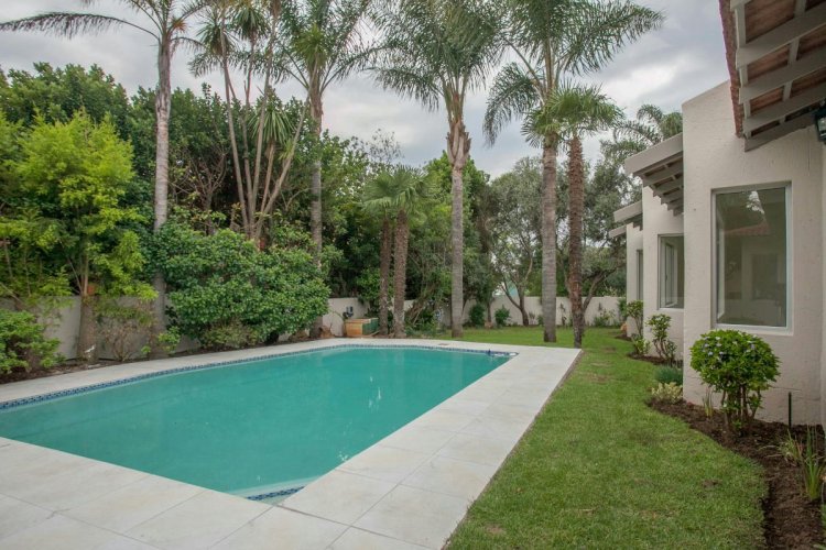 The open-plan reception areas lead out to a sparkling pool, set in a beautifully manicured garden—creating a picturesque and tranquil retreat.