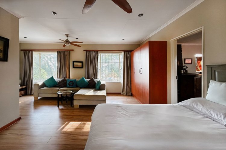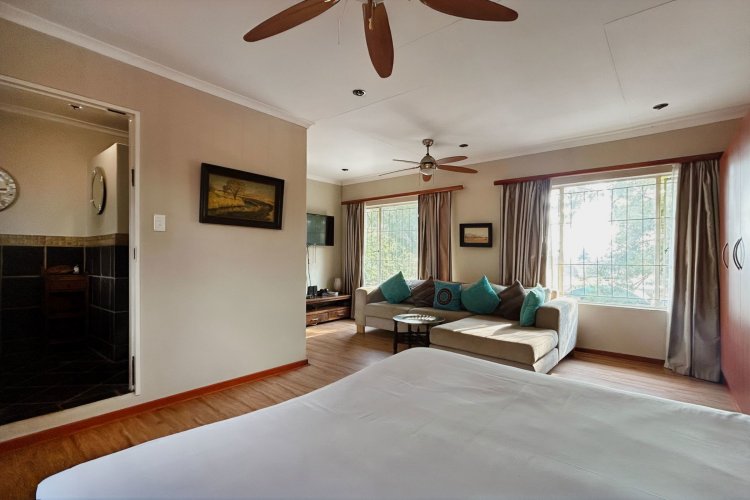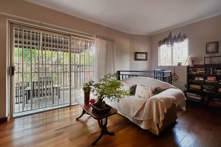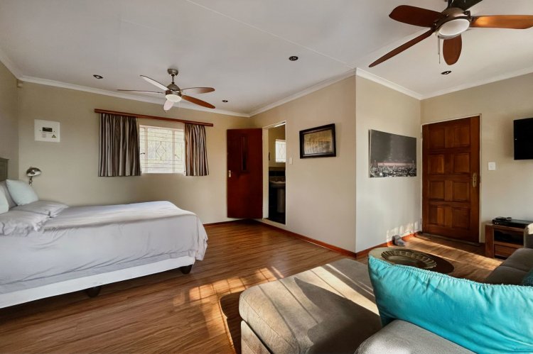 An exterior entrance leads to a private upstairs suite, complete with its own bedroom, lounge, and bathroom. This area opens onto a balcony with a lovely view, making it perfect for guests, extended family, or a peaceful retreat.