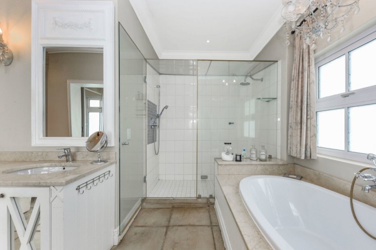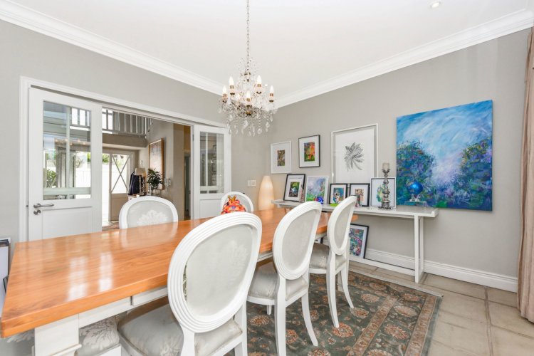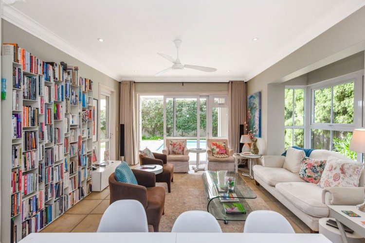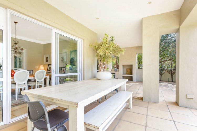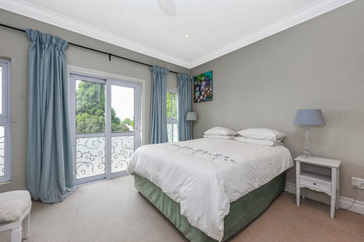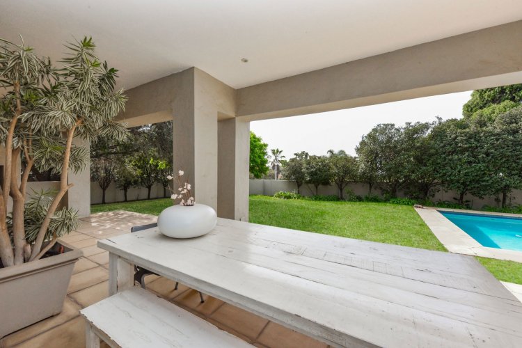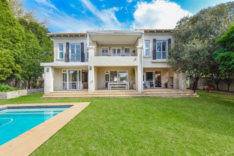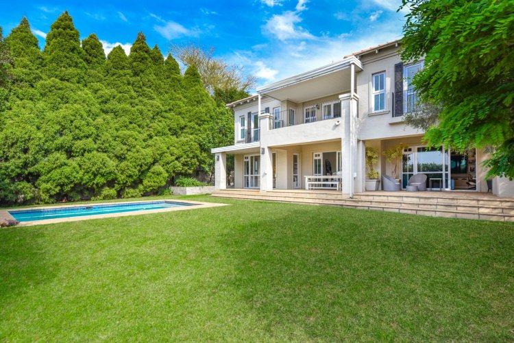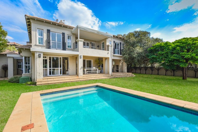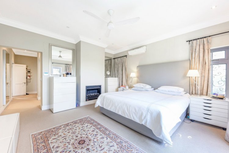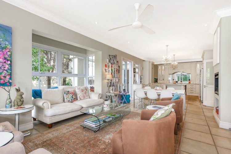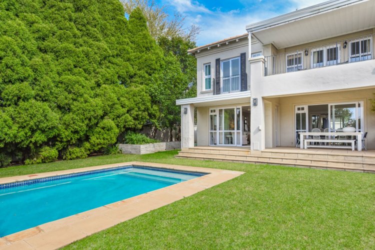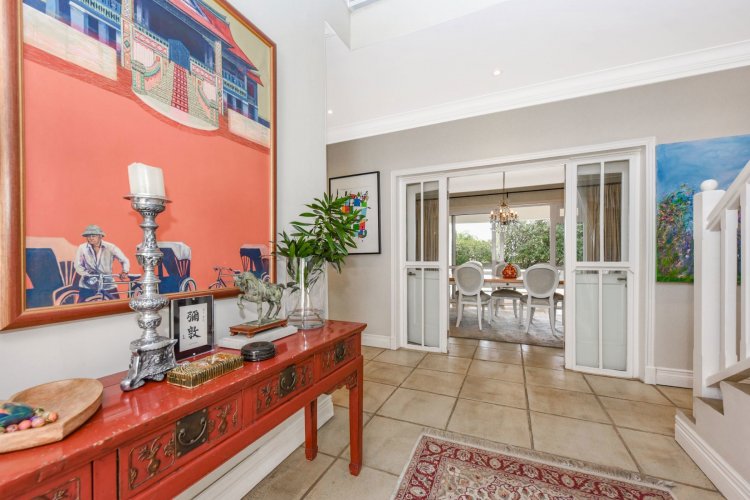 This rare treasure of a home has an inviting double volume entrance that leads to light and bright generous living spaces. All three reception rooms have aluminium sliding doors that lead out to large covered entertainers patio, spacious garden and sparkling pool. Two of the lounges have fireplaces. Stunning open plan country kitchen with a centre island, Caesar stone counter tops, space for a double door fridge, ample cupboard space and a separate scullery.