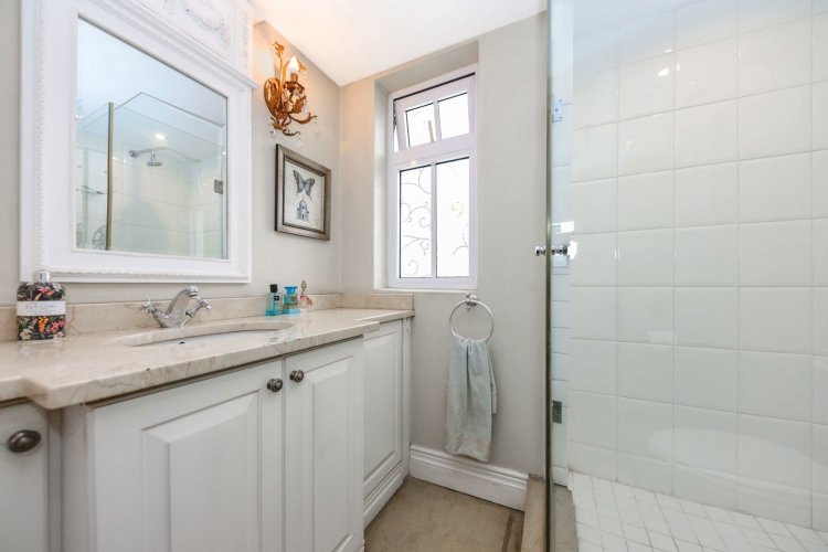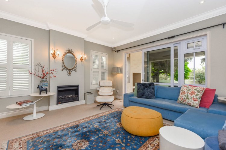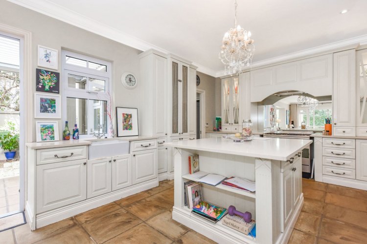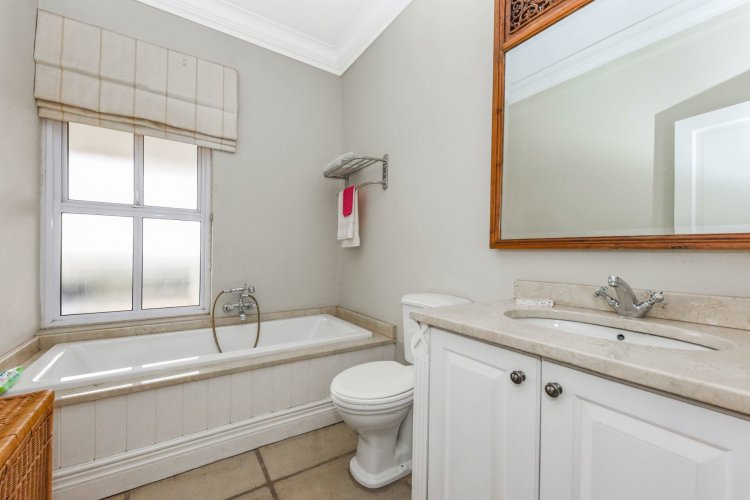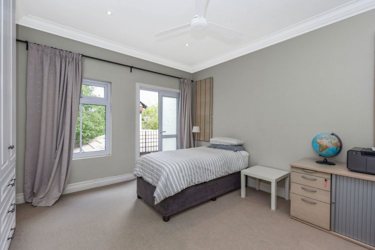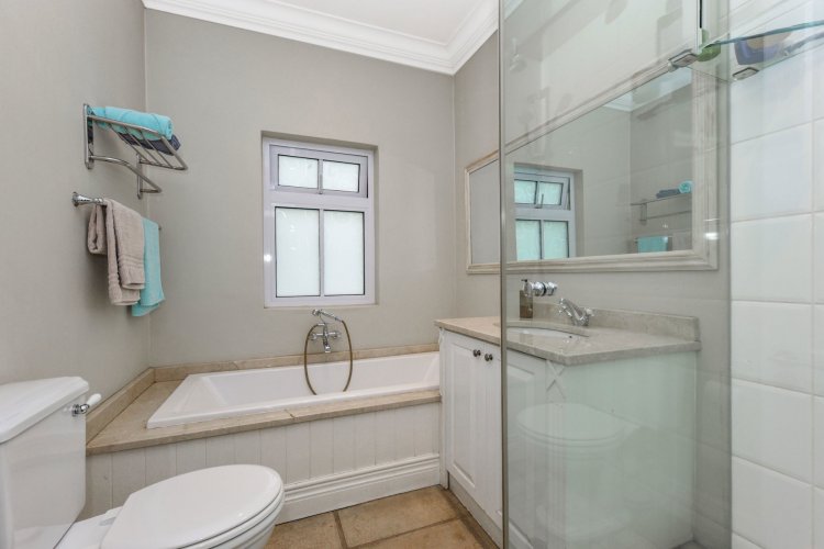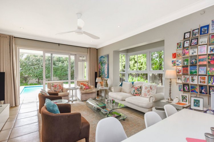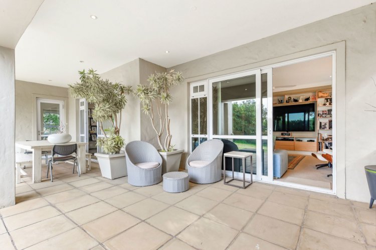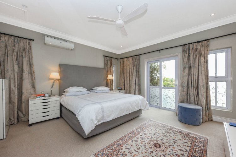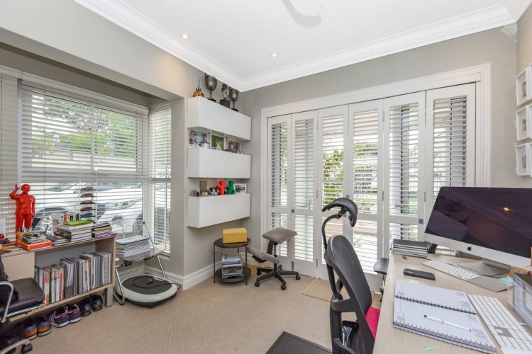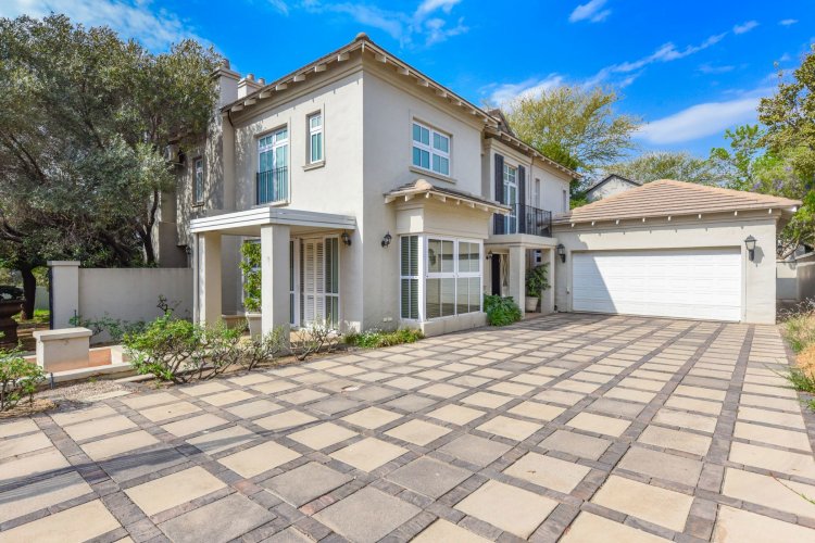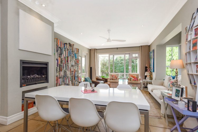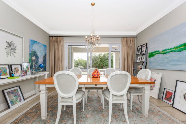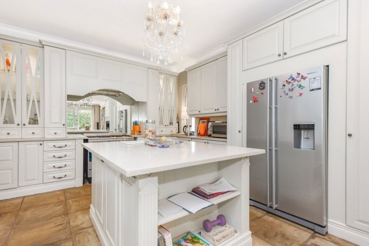 This rare treasure of a home has an inviting double volume entrance that leads to light and bright generous living spaces. All three reception rooms have aluminium sliding doors that lead out to large covered entertainers patio, spacious garden and sparkling pool. Two of the lounges have fireplaces. Stunning open plan country kitchen with a centre island, Caesar stone counter tops, space for a double door fridge, ample cupboard space and a separate scullery.