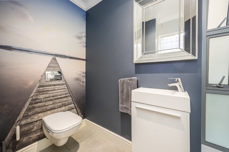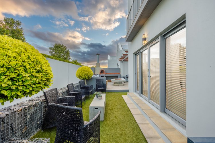 Downstairs includes a guest toilet, as well as two en-suite bedrooms. The main bedroom boasts a walk-in dressing room and a full en-suite bathroom. Both bedrooms open directly onto the garden, enhancing the indoor-outdoor feel of the home.