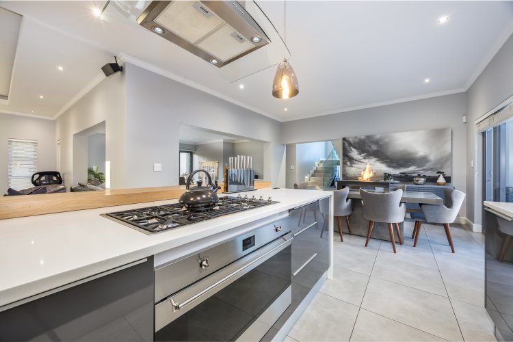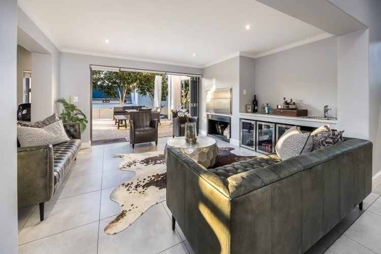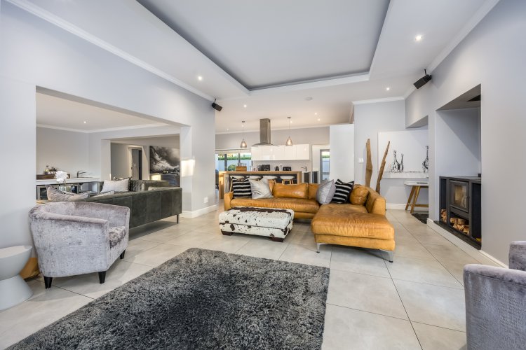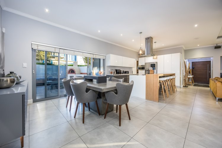 Upon entering, you are welcomed by a spacious open-plan layout filled with natural light. The beautiful, contemporary kitchen features top-of-the-range appliances and a separate, generously sized scullery. The kitchen flows seamlessly into the family, dining, and braai areas, creating an ideal space for relaxed living and entertaining.