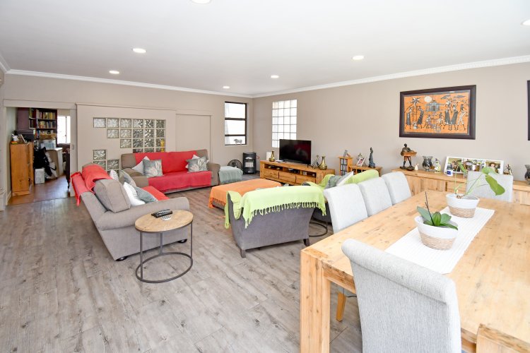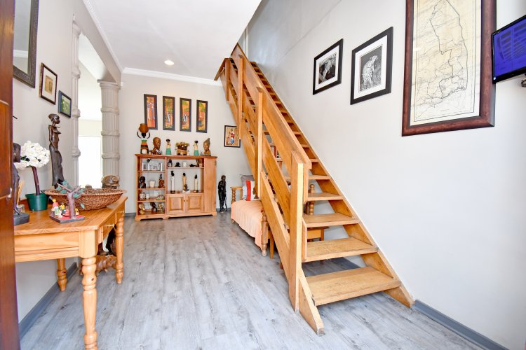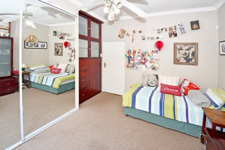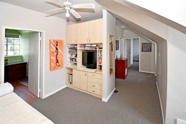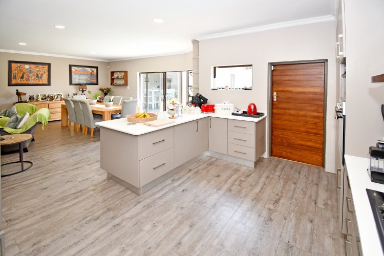 The spacious, sunny open-plan lounge, dining area and kitchen make for easy living and easy entertaining. The living area leads out to the patio and pool. The kitchen is a chef’s dream, with caesarstone-type worktops, lots of cupboards, gas hob (cylinder) and eye-level oven. There is a separate laundry.