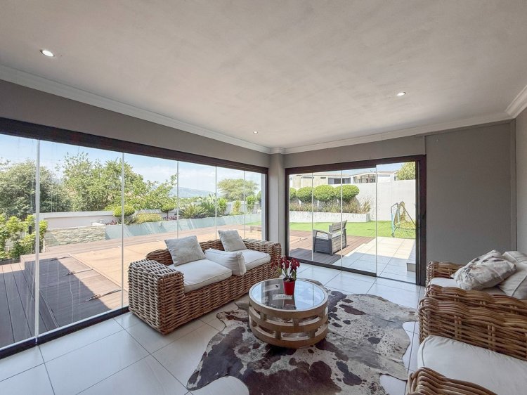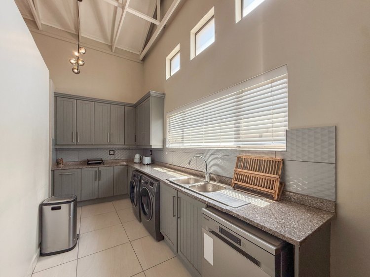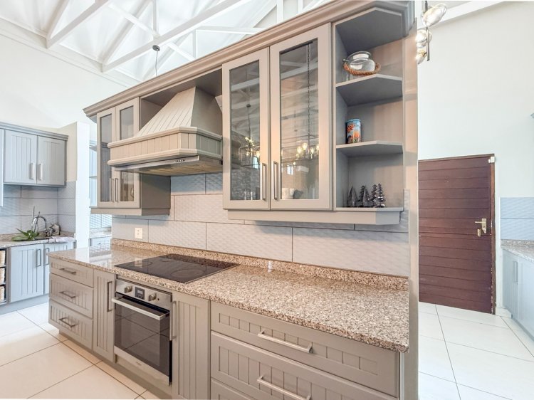 At the heart of the home lies a contemporary open-plan kitchen that connects effortlessly with the living areas. Featuring a large central island, abundant workspace, and a separate scullery, this kitchen is perfectly suited to family living and entertaining alike. The spacious living areas open onto an enclosed patio complete with a built-in braai and wine rack, creating a versatile space for year-round enjoyment.
