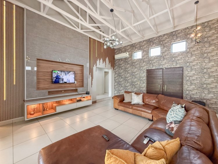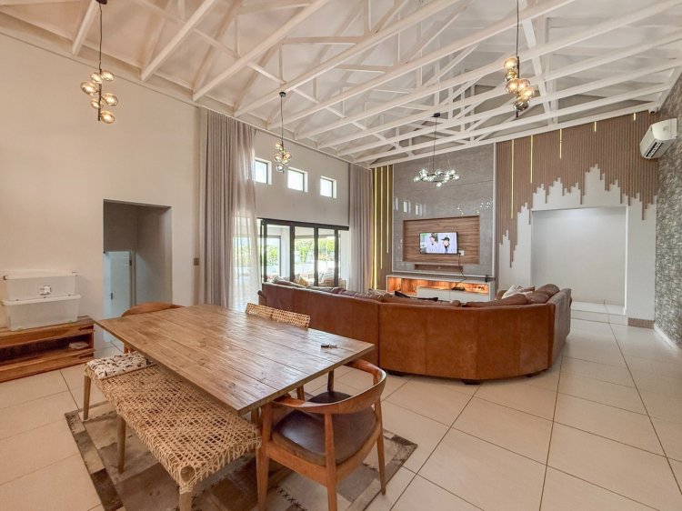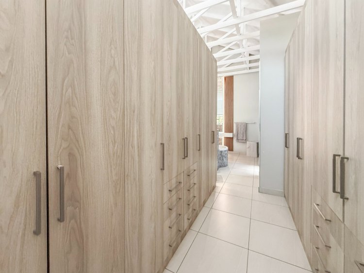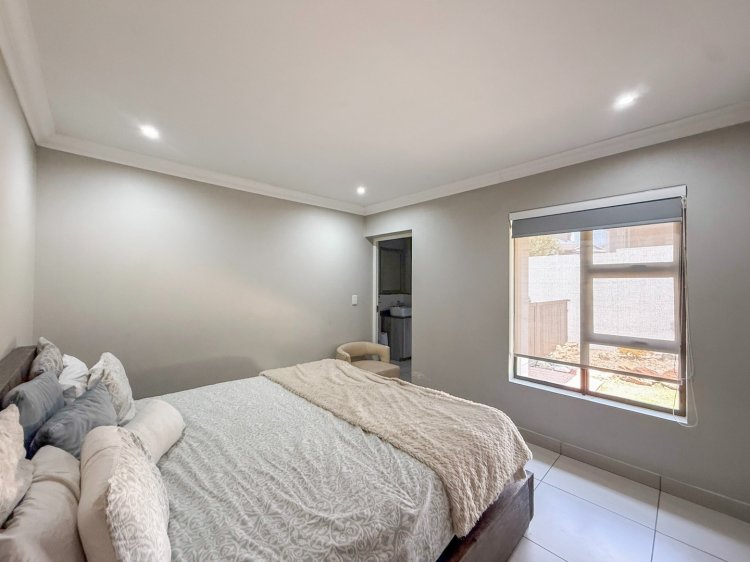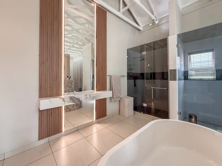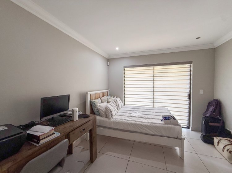 The accommodation is intelligently arranged with three bedrooms positioned on one wing of the home, creating a private family zone. Two of these bedrooms are en-suite, while the third is serviced by a separate bathroom that also doubles as a guest bathroom. The main bedroom is a true sanctuary, finished with luxurious touches, ample built-in cupboards, and a sophisticated en-suite bathroom designed for comfort and indulgence.