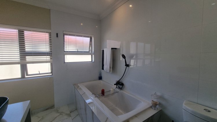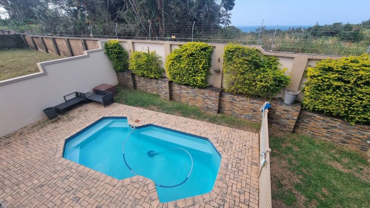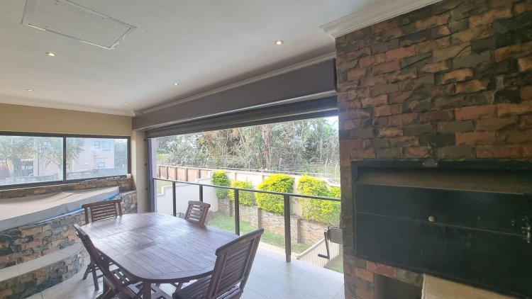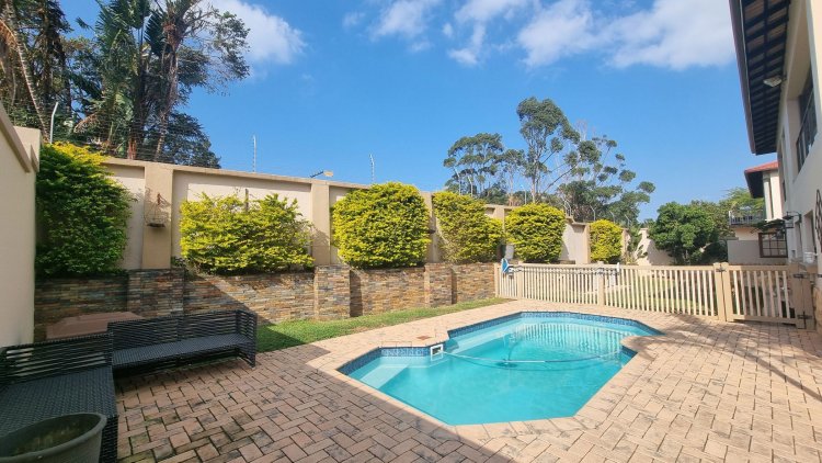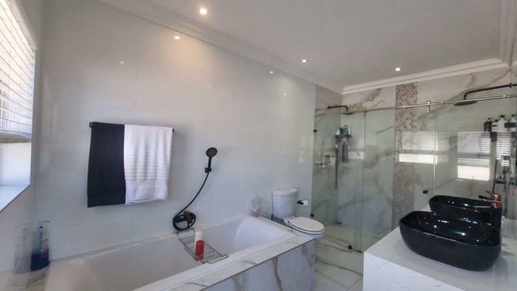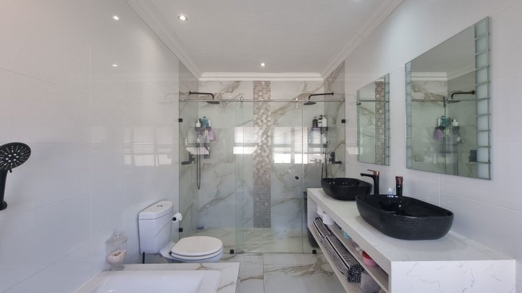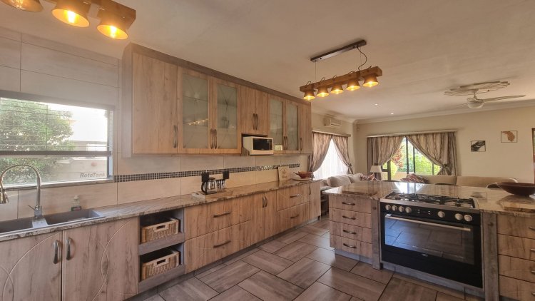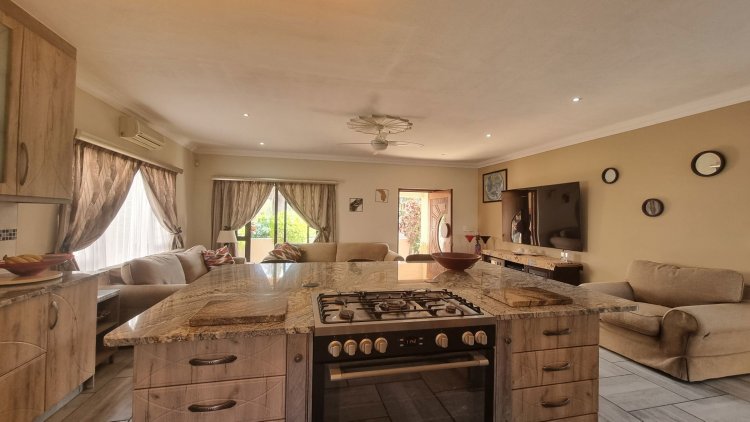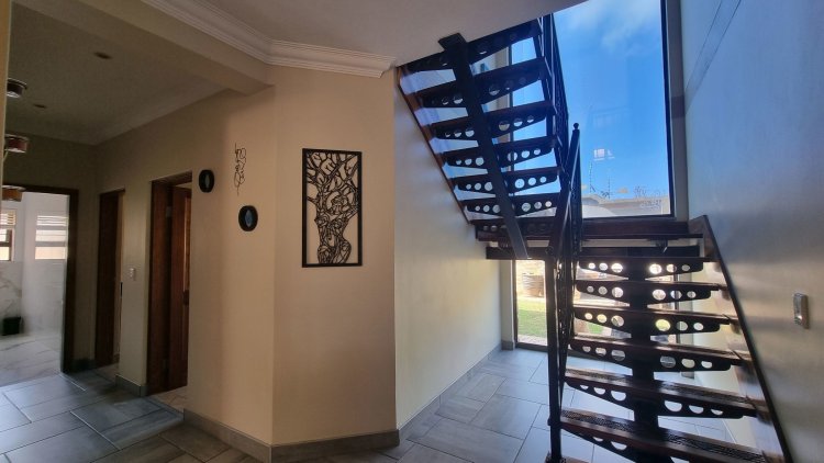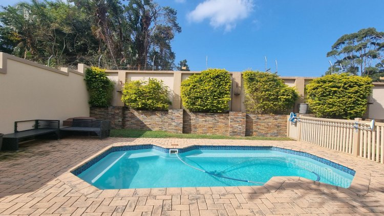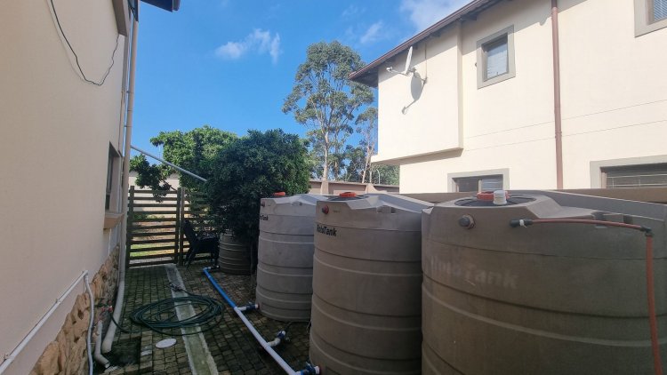 Outdoors, a sparkling swimming pool takes centre stage, perfect for summer days with family and friends. The paved courtyard and entertainment space provide a low-maintenance setting, while JoJo water storage tanks ensure peace of mind during water outages.