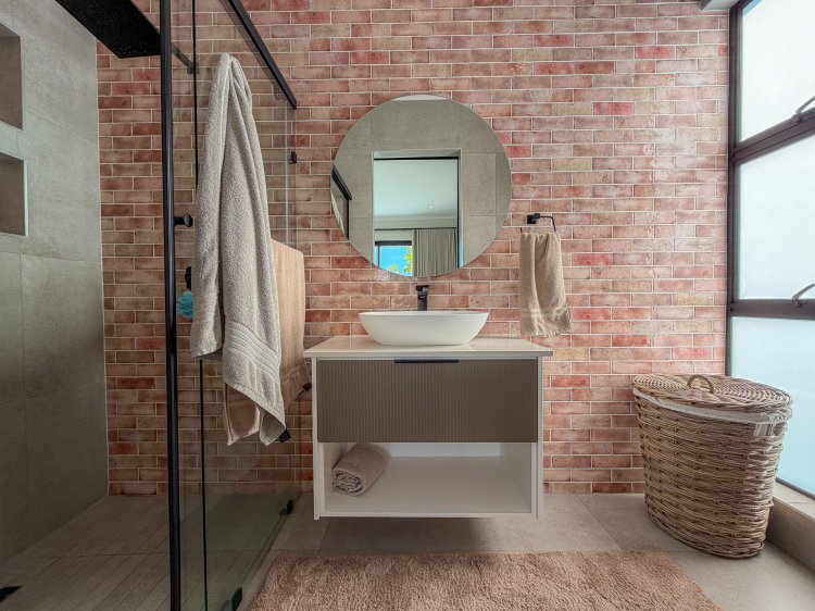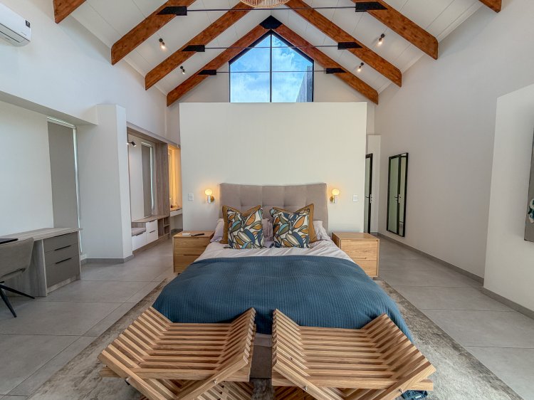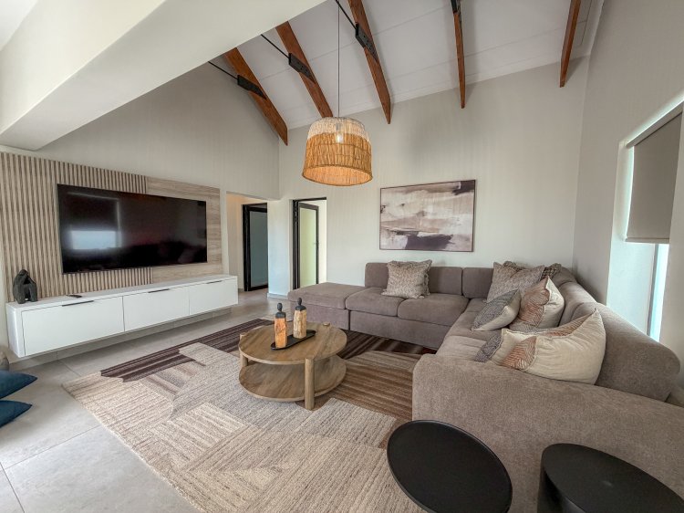 Upper Level - PJ lounge with open trusses, roller blinds, and access to a balcony - Three additional en-suite bedrooms, each with open trusses and high ceilings - One bedroom with balcony access, bath, and shower - One private en-suite bedroom - One south-facing en-suite bedroom with vanity, shower, and roller blinds