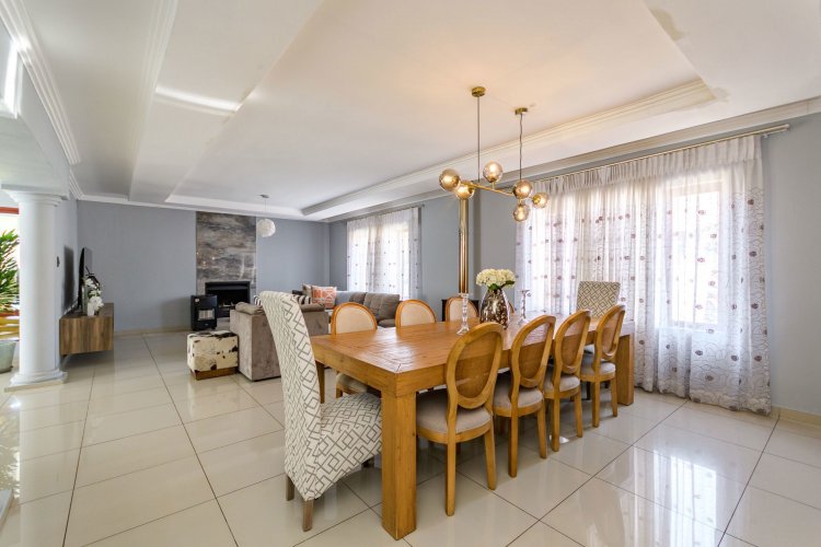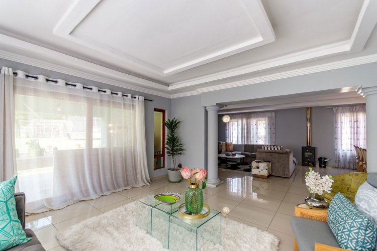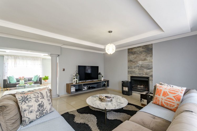 The open-plan design connects extensive living areas: dining area, T.V room with fireplace, plus a formal lounge leading out to the porch.