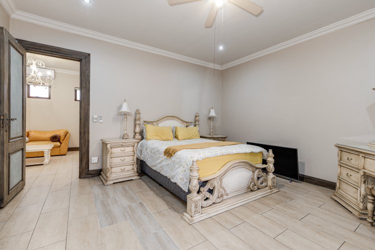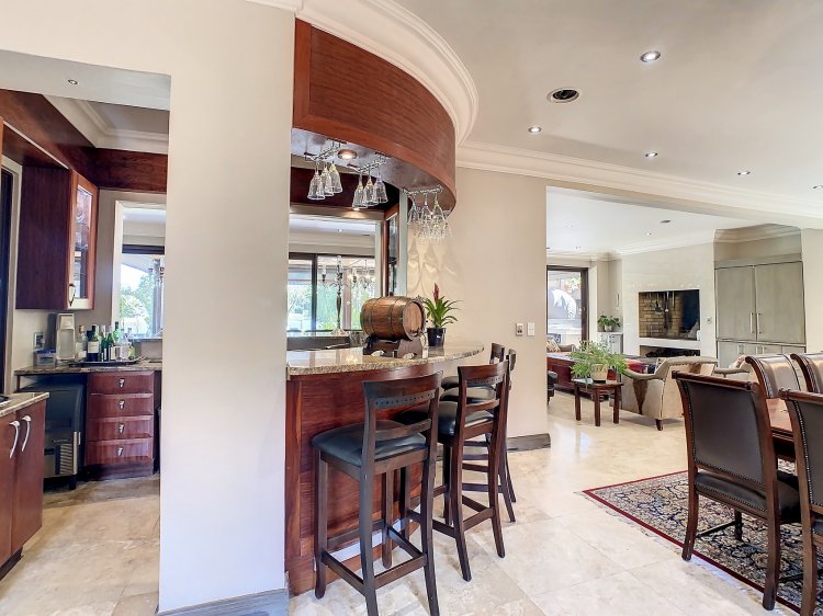 Fully furnished property fit for the connoisseur, situated on the banks of the lake in the game reserve welcoming you through the double volume entrance, offering a lifestyle of family living and entertaining. A number of reception areas are served by the gourmet kitchen that includes quality built-in appliances, walk-in fridge and separate scullery and laundry. The living areas include a lounge, two large dining areas, a built-in bar and a cinema/wine-tasting room. The large enclosed braai room leads to the covered patio with pizza oven, boma-braai area, swimming pool, sauna and steam rooms. All of this while small game is roaming on your doorstep.