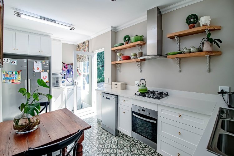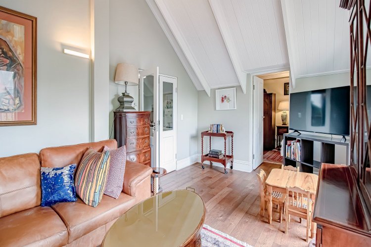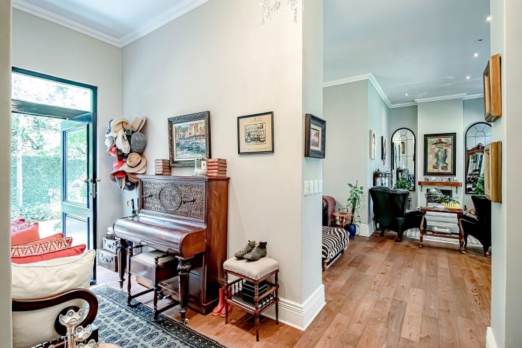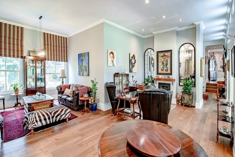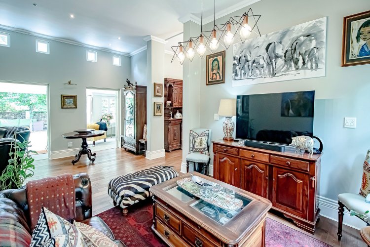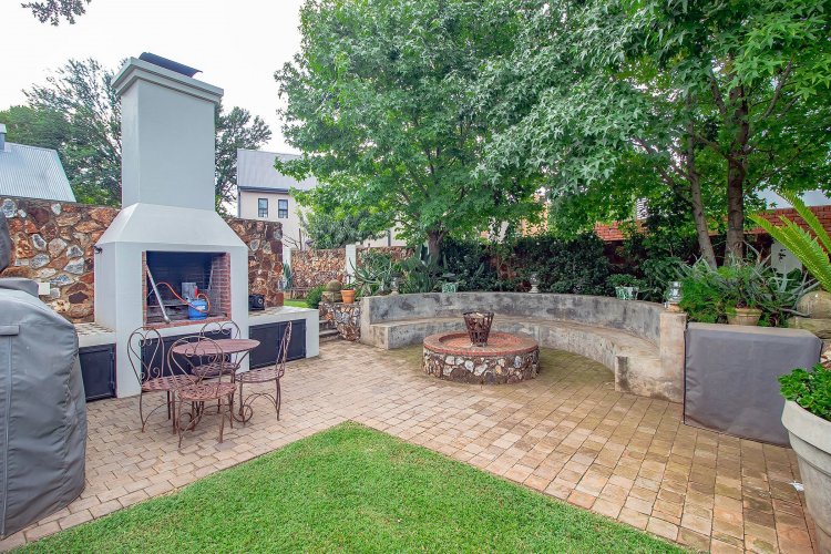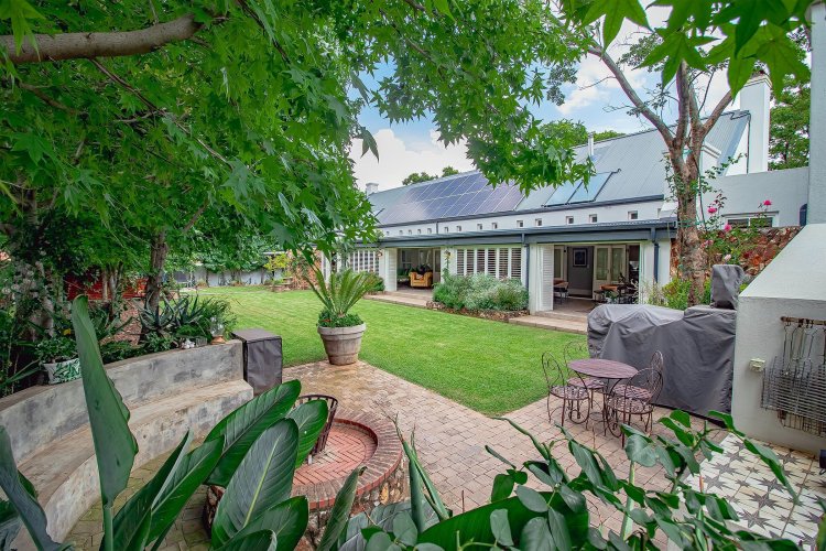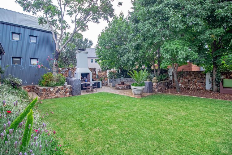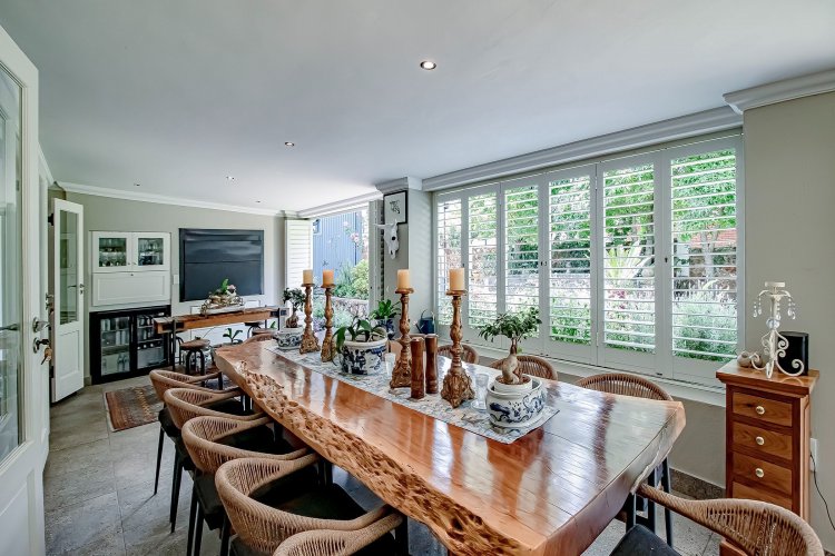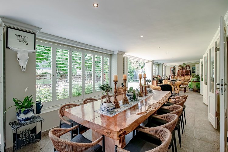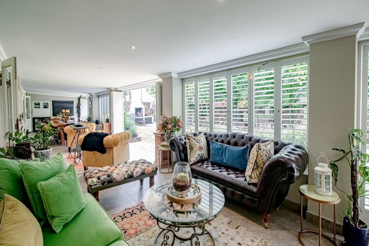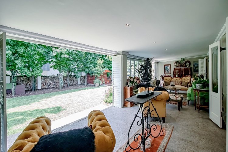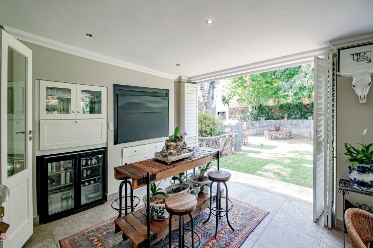 The interior boasts multiple reception spaces, allowing for both formal and informal living. These areas flow seamlessly into the kitchen and out to the covered patio, creating a harmonious connection between indoor and outdoor spaces. Large sliding doors open onto the garden, making this home perfectly suited to year-round entertaining, whether hosting relaxed weekend braais or elegant gatherings.