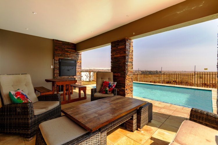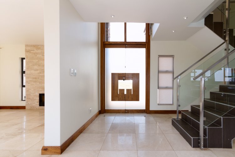 Ascend the feature staircase to discover five generously sized bedrooms, all fitted with mirror sliding built-in cupboards and porcelain tiled floors. Two of the bedrooms open onto private balconies with panoramic views of the lush Game Reserve – a constant reminder that you're living on the edge of something extraordinary.
