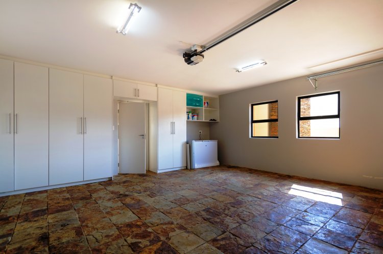 The double automated garage offers direct access into the home and is a functional space with built-in cupboards and slate tiled flooring, making organization a breeze.