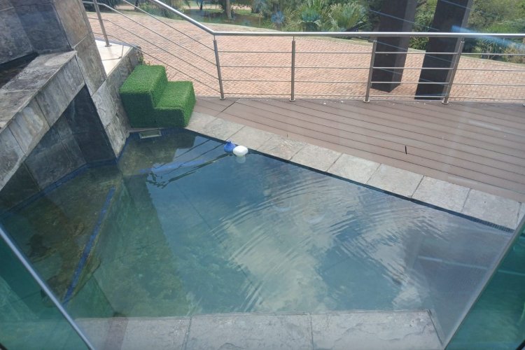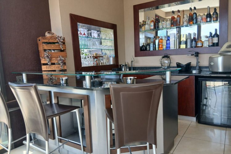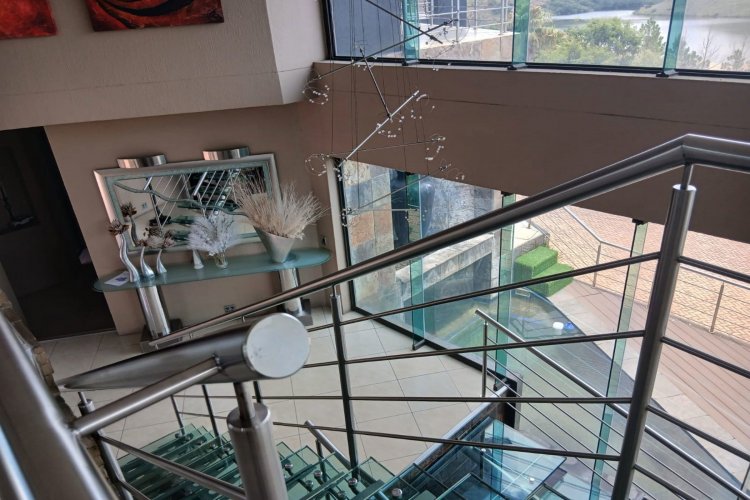 Designed for modern, off-grid living, the property features a powerful 70kWh solar system, an automatic generator, and a borehole connected to solar, ensuring uninterrupted sustainability. Five garages, a large executive office, and a fully fitted, never-used gym complete the practical luxuries. Architectural excellence is evident in the chrome-finished staircase, frameless glass doors and windows, and seamless indoor-outdoor flow. Entertain in style with a built-in braai and bar, an indoor sparkling pool that overflows into the outdoor swimming pool, all while taking in the shimmering waters of the dam.