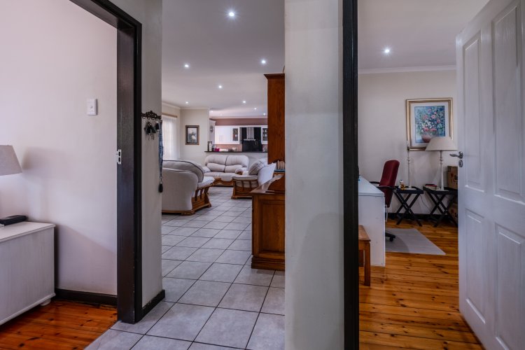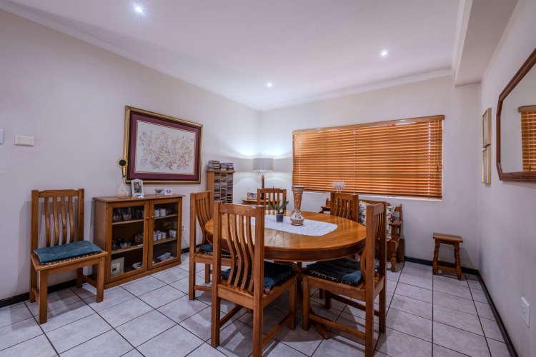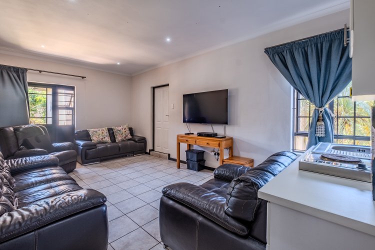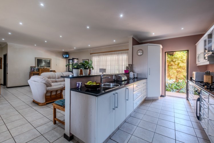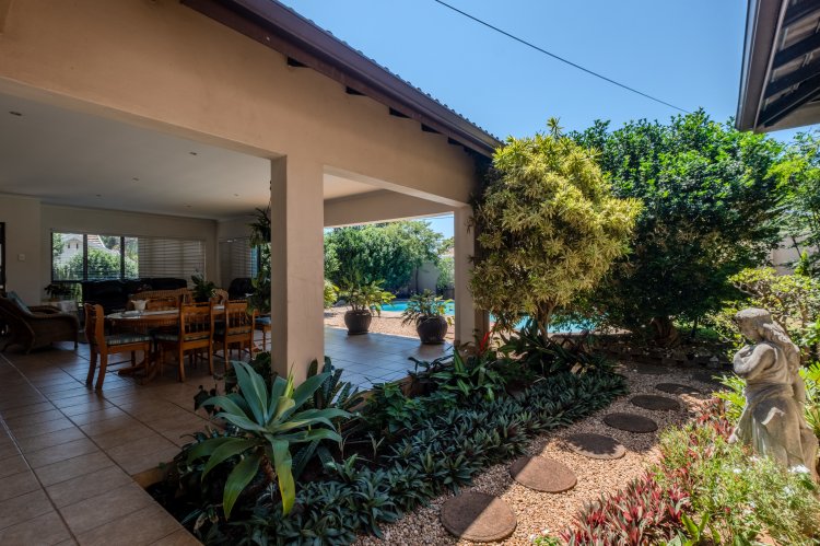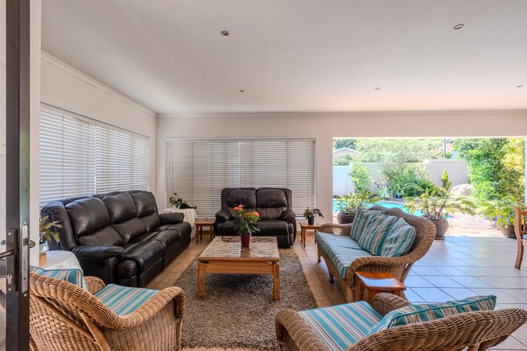 The front of the home is where family life and entertaining truly come alive. A large covered patio overlooks a sparkling swimming pool and lush gardens that create a tranquil, tropical atmosphere — the perfect setting for weekend braais, children’s parties, or simply relaxing outdoors. The open-plan living areas flow effortlessly, offering generous space for both lounge and dining, filled with natural light and warmth.