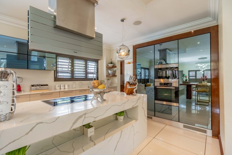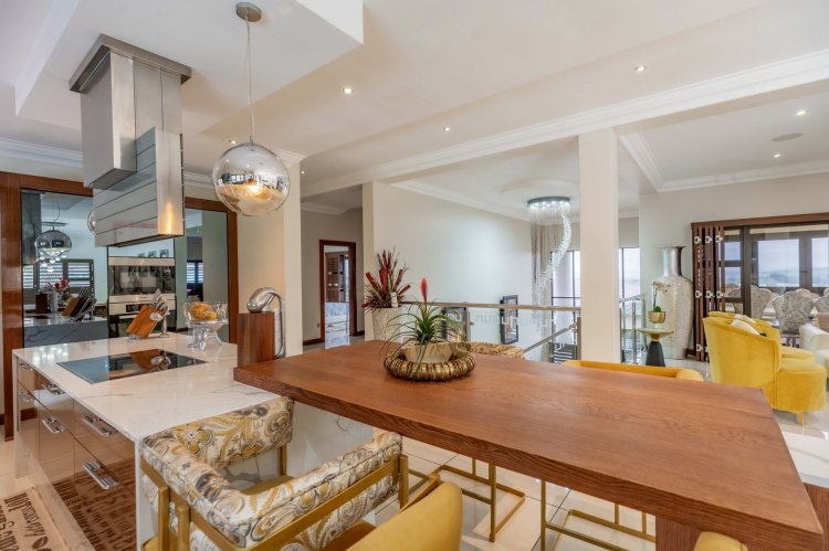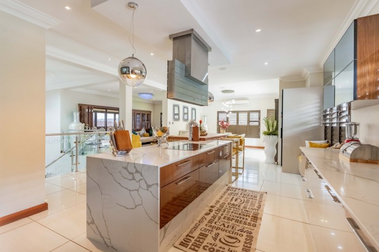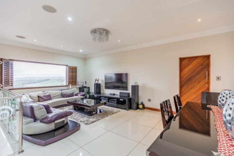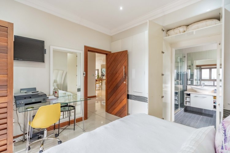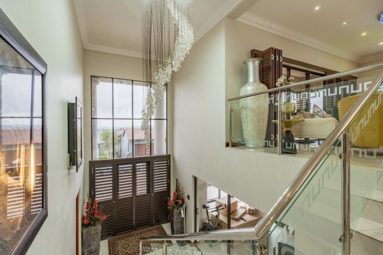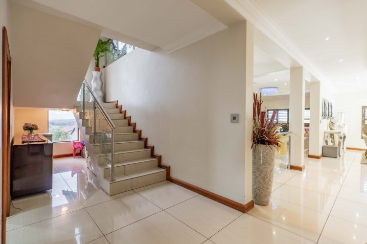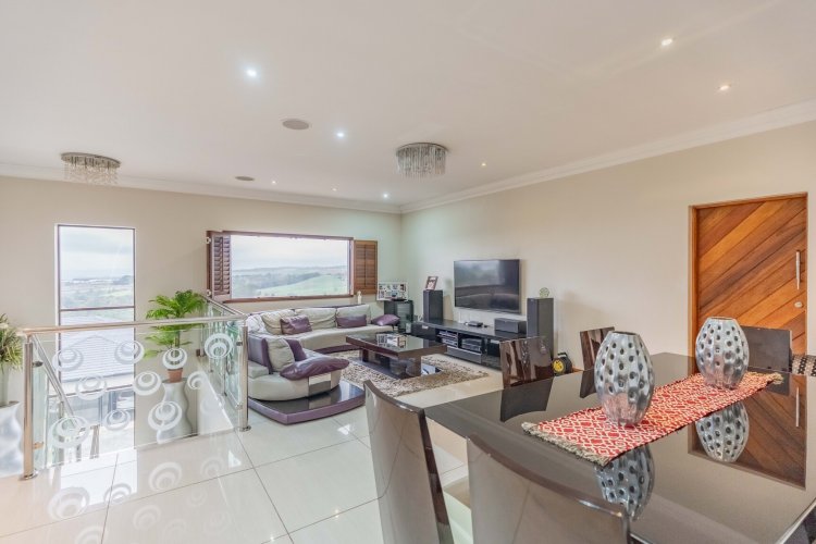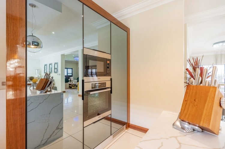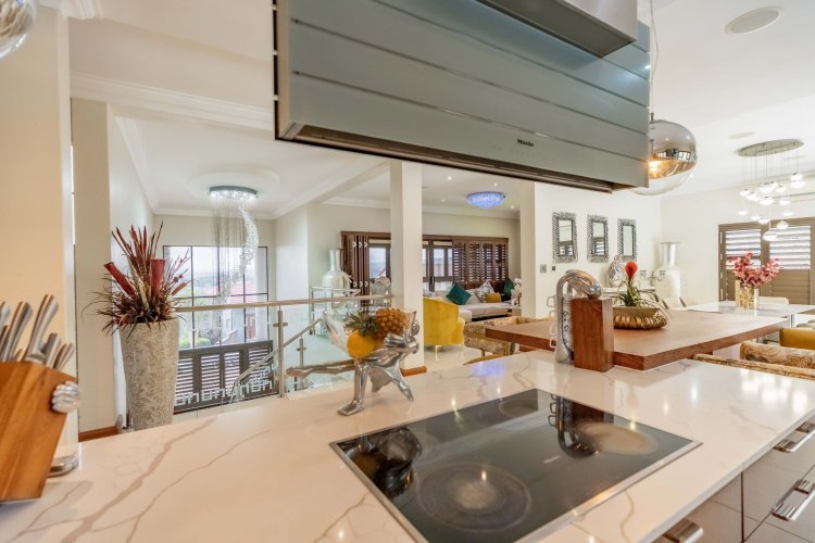 The designer lounge is adjoined by a separate formal dining room with views over Assagay and Shongweni, and has a guest loo nearby, while the upmarket, modern kitchen has marbled white countertops, prep bowl, top of the range Miele eye level oven and microwave, along with mirror finished fridge, bar fridge, cupboards and a kitchen island with state-of-the art extractor unit over the electric hob.