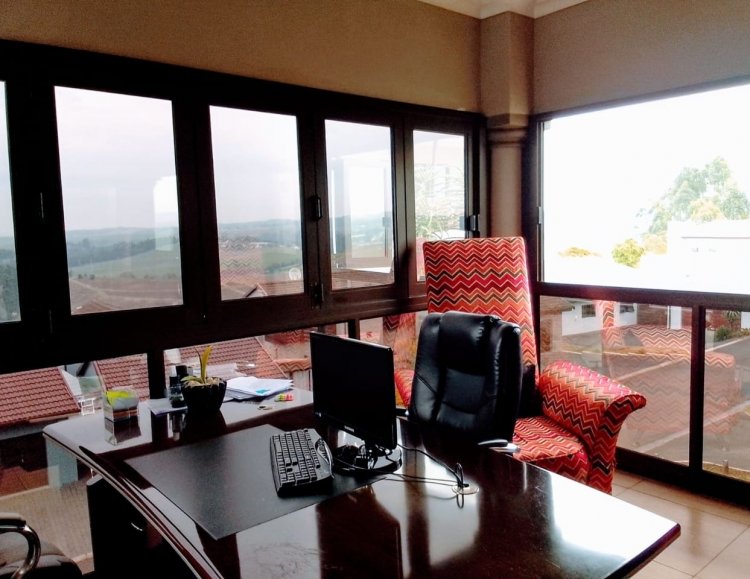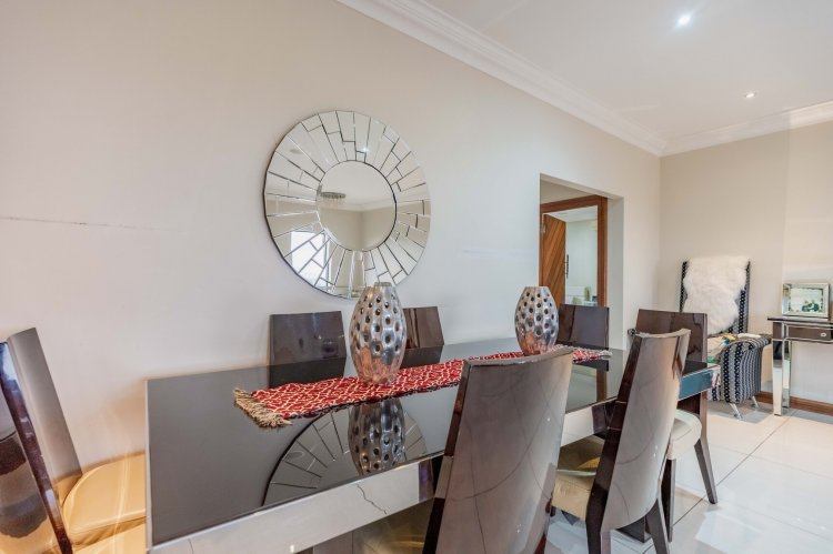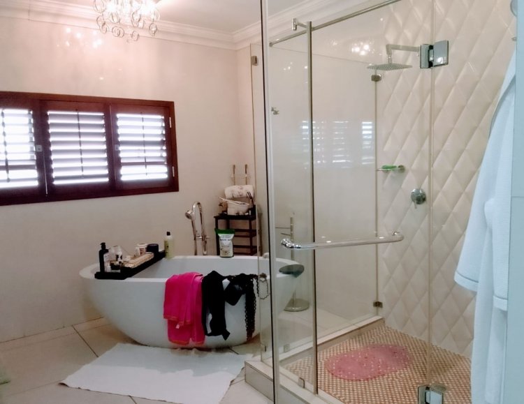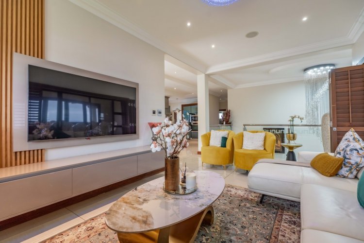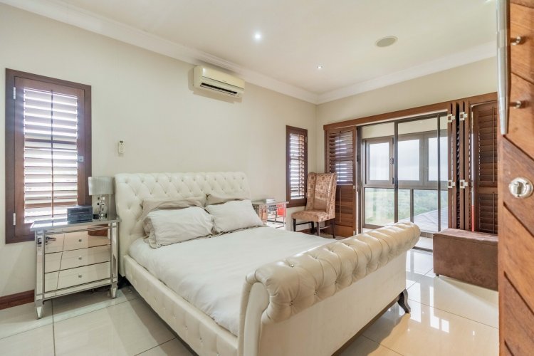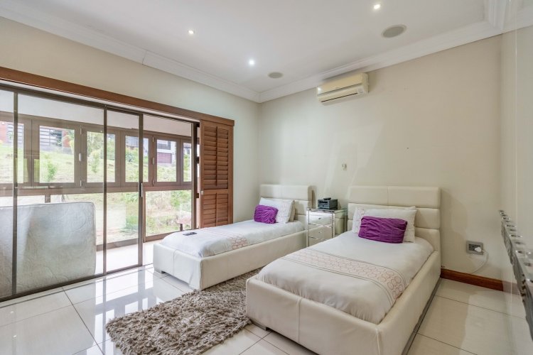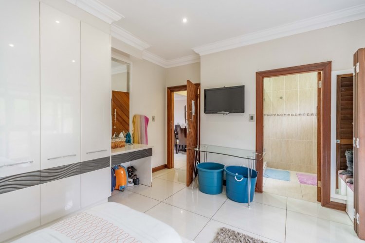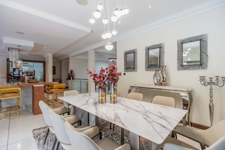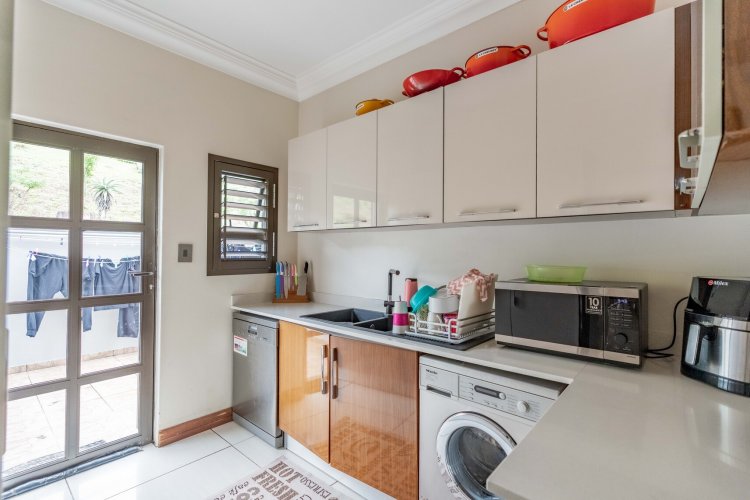The designer lounge is adjoined by a separate formal dining room with views over Assagay and Shongweni, and has a guest loo nearby, while the upmarket, modern kitchen has marbled white countertops, prep bowl, top of the range Miele eye level oven and microwave, along with mirror finished fridge, bar fridge, cupboards and a kitchen island with state-of-the art extractor unit over the electric hob.