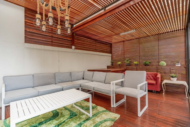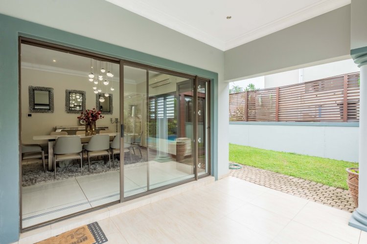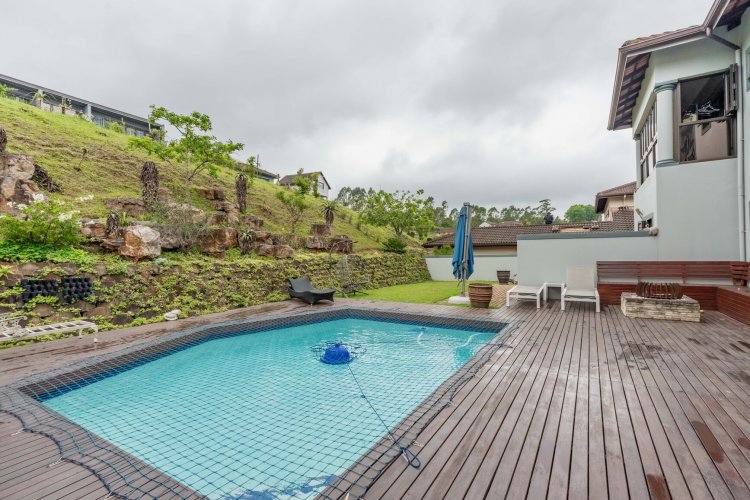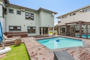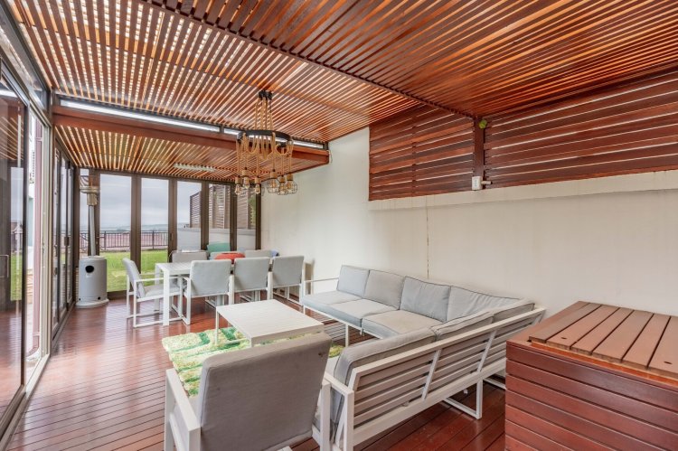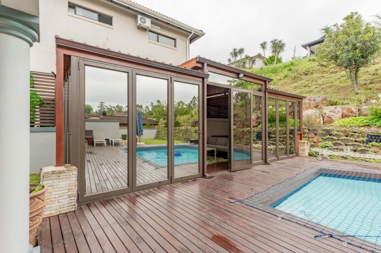 The private and spacious air-conditioned informal dining area alongside the kitchen flows onto a simply sublime pool deck enclosing a bright blue pool with a private pool house alongside, which has an informal lounge with eclectic chandelier and custom- made pool pump and cover.